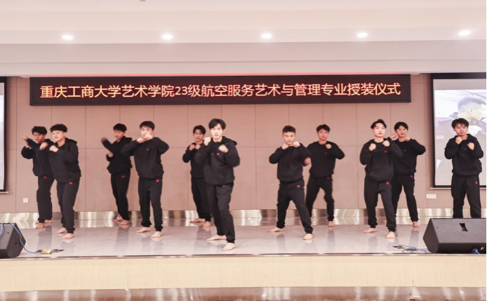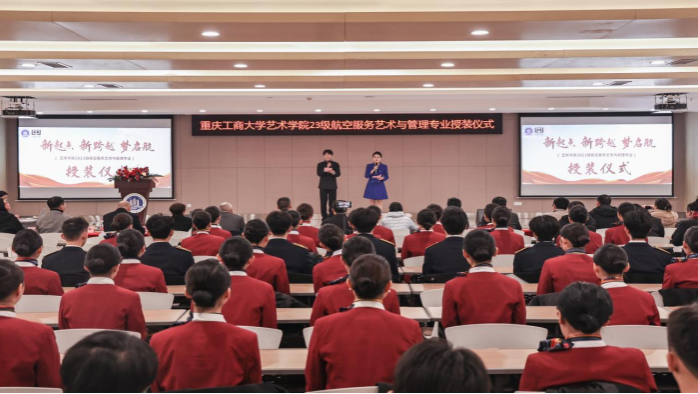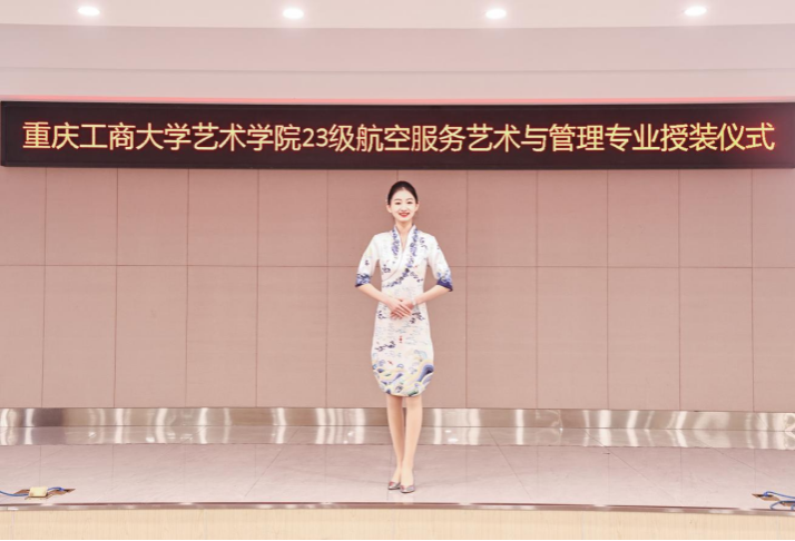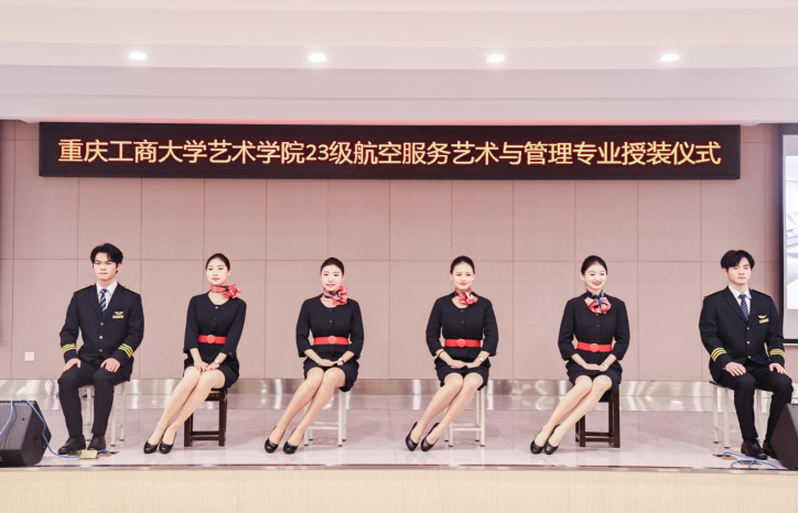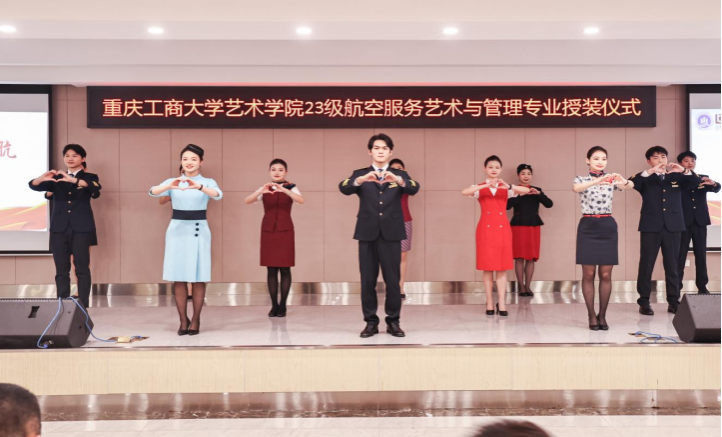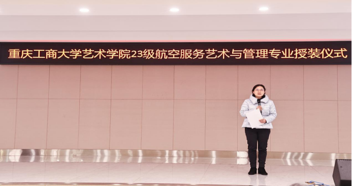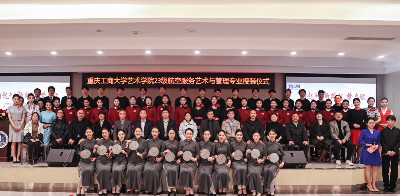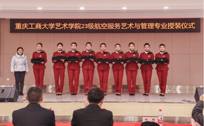 1月7日,艺术学院航空服务艺术与管理专业制服授装仪式在万象城娱乐awc线路南岸校区学生就业指导中心报告厅举行。副校长柏群,北京中航未来教育集团董事长刘永、副总裁张鹏、教研总监张利,安徽云翔未来科技有限公司总经理彭春,党委学工部部长申卫东,国内合作发展处处长刘代成,教务处处长骆东奇,招生就业处处长钟增胜,财务处处长王燕,艺术学院党政领导、教师代表和全体2023级航空服务艺术与管理专业学生参加了活动。