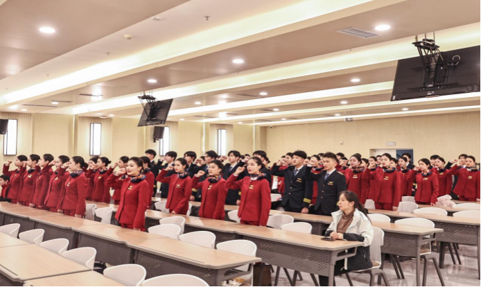 在制服授装仪式中,全体学生整装肃立,学校领导和集团领导为他们逐一授装。授装完毕后,全体航空服务艺术与管理专业的学生庄严宣誓,承诺维护专业形象,遵守万象城娱乐awc线路校规与民航职业行为规范,为成为一名优秀的民航人时刻准备。