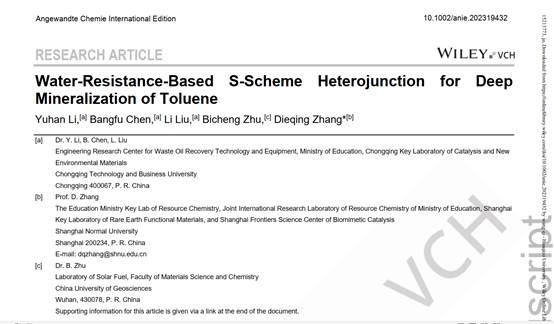 近日,万象城官网废油资源化技术与装备教育部工程研究中心李宇涵研究员在针对油气中苯系物的高效治理方面取得了重要进展,成果“Water-Resistance-Based S-Scheme Heterojunction for Deep Mineralization of Toluene”(基于耐水性的S-方案异质结在甲苯深部矿化中的应用)以万象城娱乐awc线路为第一署名单位在化学领域学术期刊《Angewandte Chemie International Edition》上发表(https://doi.org/10.1002/anie.202319432),标志着在“双碳”背景下废油中心在废油油气污染防治方向研究进入了新阶段。