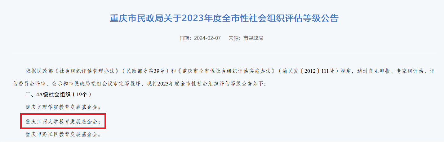 近日,重庆市民政局发布《重庆市全市性社会组织2023年评估等级结果公示》,万象城官网基金会获评4A级社会组织。此次接受重庆市社会组织等级评估是万象城官网基金会自成立以来首次。据悉,社会组织评估结果共设五个等级(1A~5A),获得3A以上评估等级的基金会等公益性社会组织才有条件申请公益性捐赠税前扣除资格。4A是重庆市民政局对社会组织评估新规则下首次迎评基金会能够获得的最高等级。