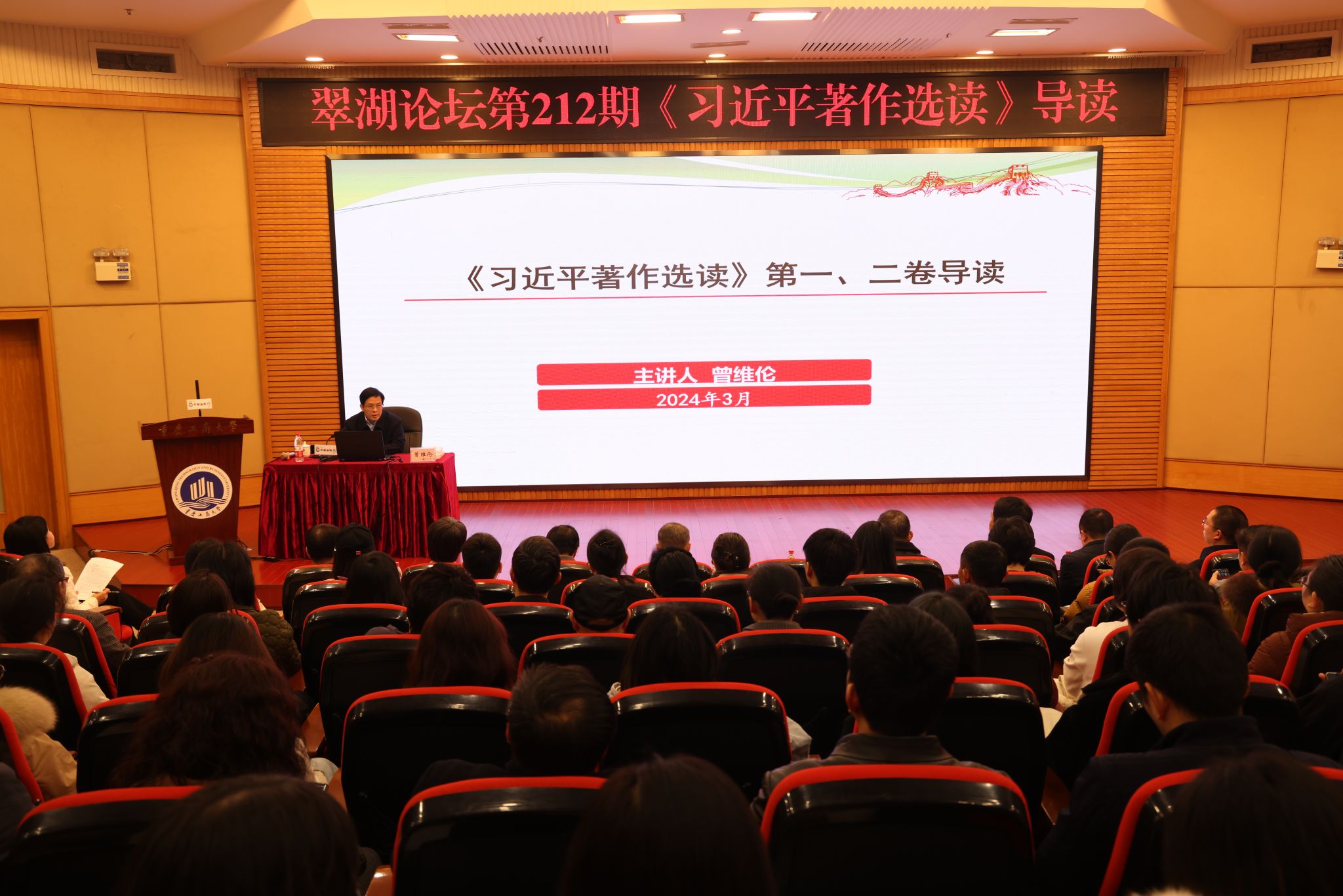3月8日上午,万象城官网在博智楼7200报告厅举办翠湖论坛第212期《习近平著作选读》导读讲座。翠湖论坛由学校图书馆主办,邀请了学校党委书记曾维伦作专题讲座。学校党委常委、副校长陈运超,相关职能部门负责人和师生代表250余人参加。