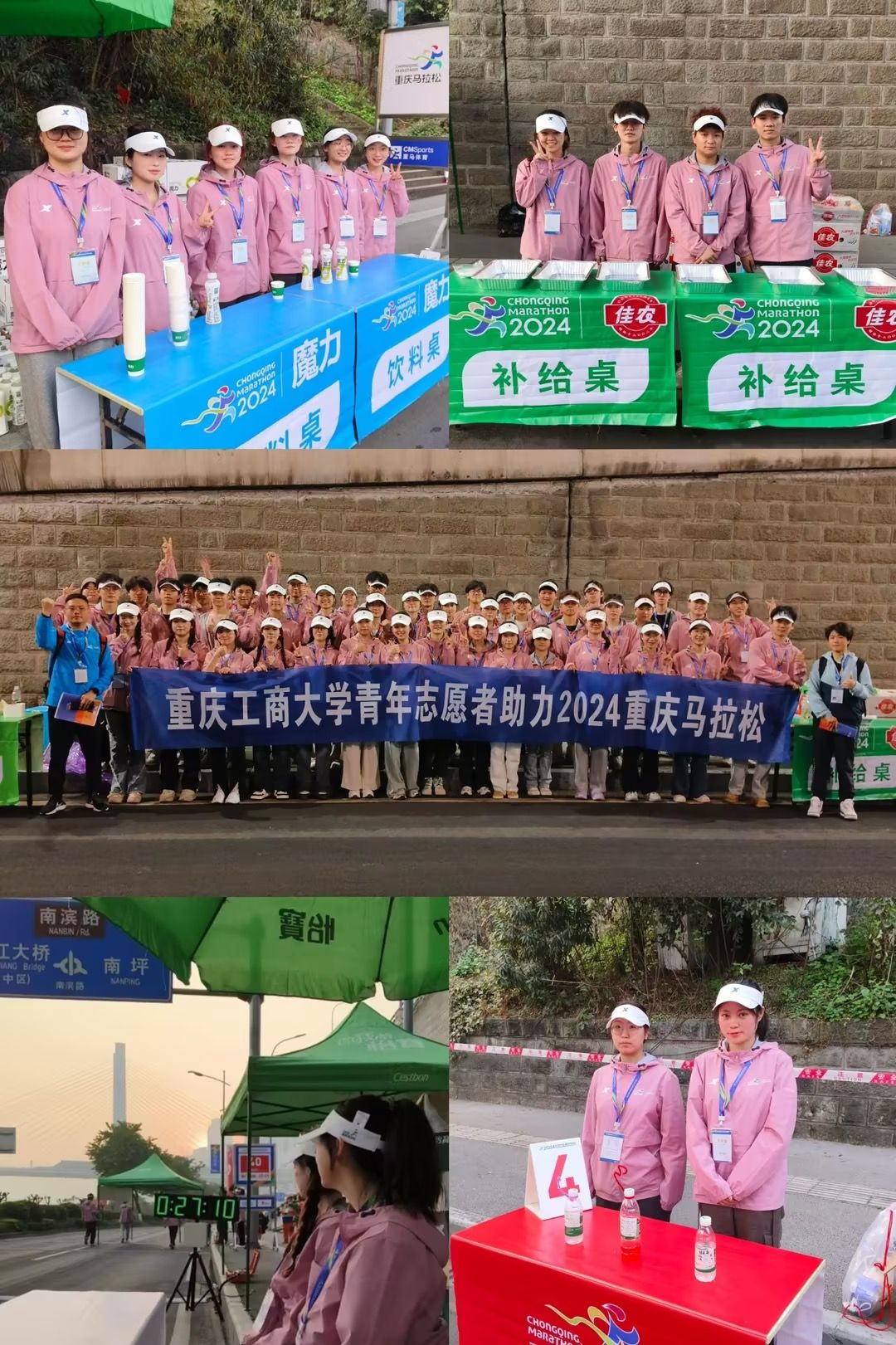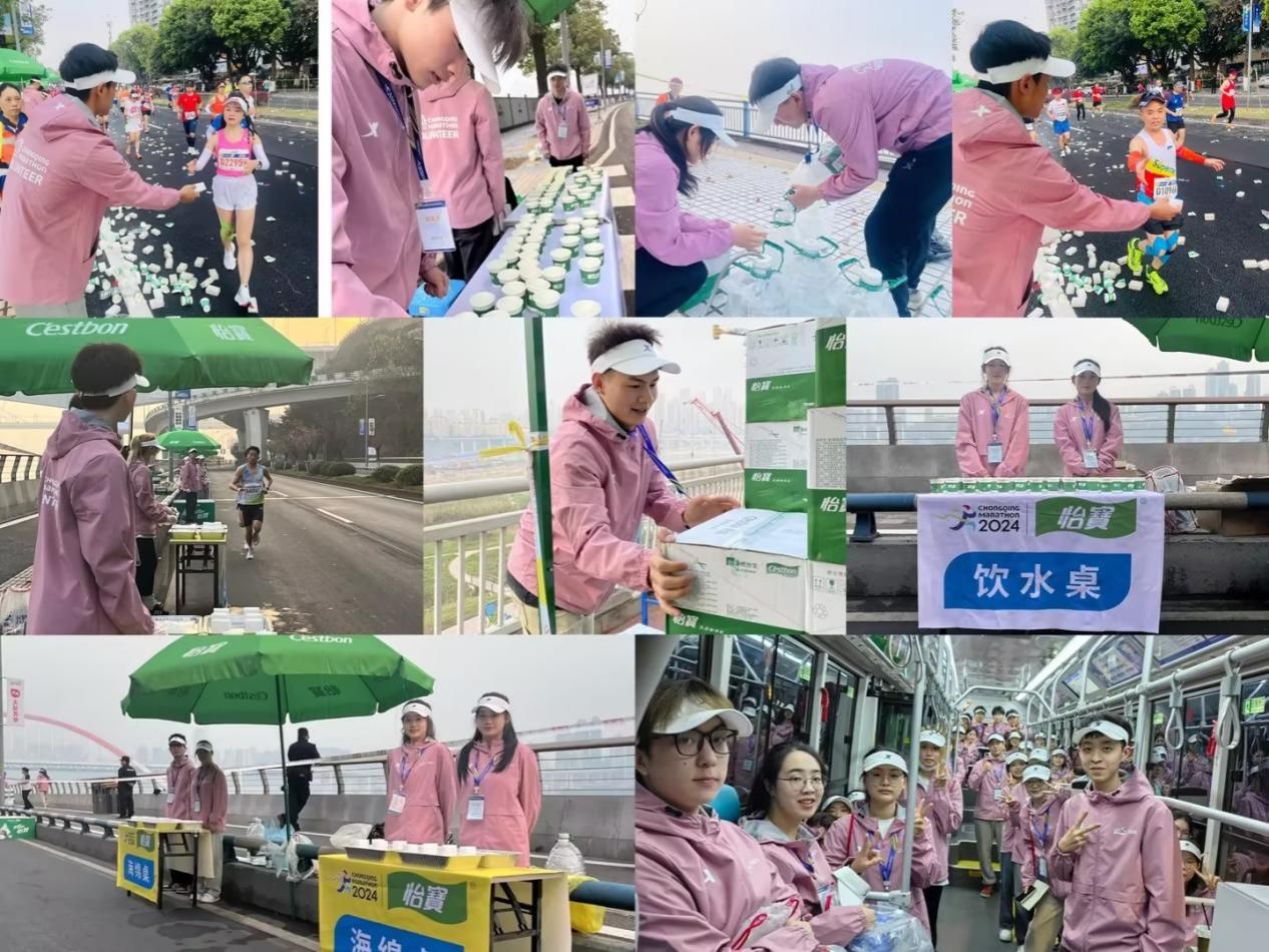本次马拉松志愿者招募由校团委联合重马组委会、国内合作处、体育学院、管理科学与工程学院开展,自1月起面向全校学生进行招募选拔。3月8日,在南岸校区7100举行了志愿者培训工作。3月24日凌晨5点,全体志愿者在校前广场整装出发,前往南滨路12.5km、15km、17.5km、35km、37.5km、40km六个关键补给站开展服务。比赛中,志愿者们为参赛选手提供饮水饮料、喷淋降温、能量补给、冷喷等工作。从凌晨5点到下午2点,同学们始终遵守赛事服务准则,在工作人员的安排下,有序开展服务,为助力赛事的顺利进行贡献力量。