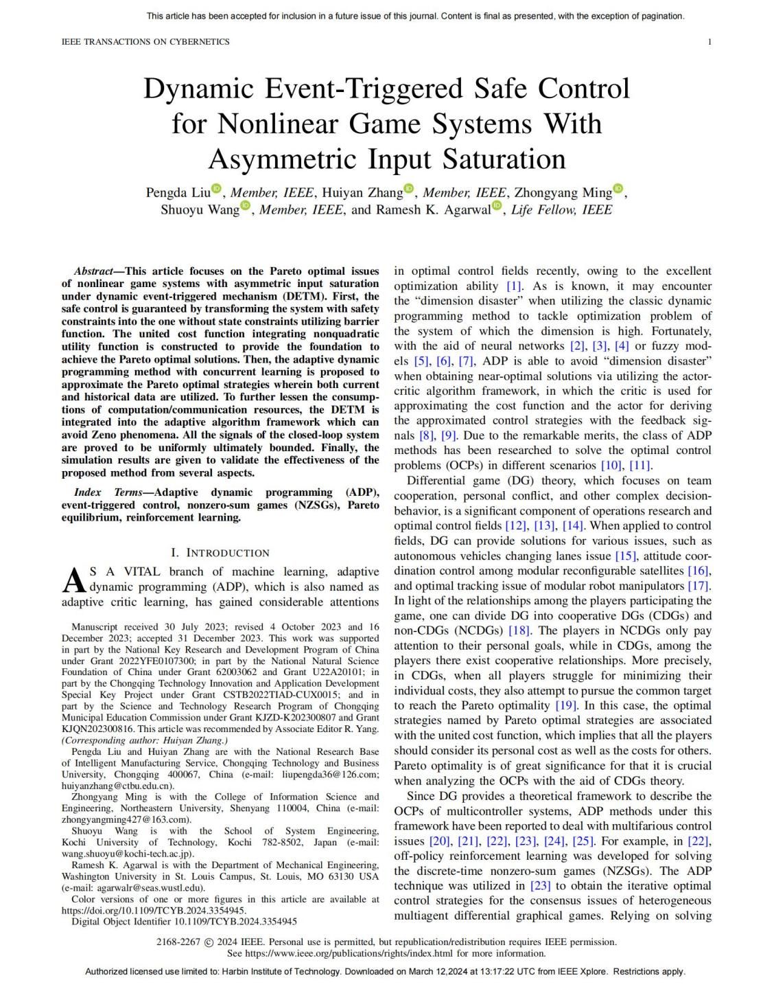近期,万象城官网智能制造服务国际科技合作基地(国合基地)无人智慧系统协同控制团队刘鹏达博士与日本工程院院士王硕玉教授、斯坦福大学Ramesh K. Agarwal教授合作,在国际智能控制领域顶级期刊IEEE Transactions on Cybernetics上发表了题为“Dynamic Event-Triggered Safe Control for Nonlinear Game Systems With Asymmetric Input Saturation”(非对称输入饱和非线性博弈系统的动态事件触发安全控制)的学术论文(DOI:10.1109/TCYB.2024.3354945),在非线性系统智能优化与安全控制领域取得了突破性进展。