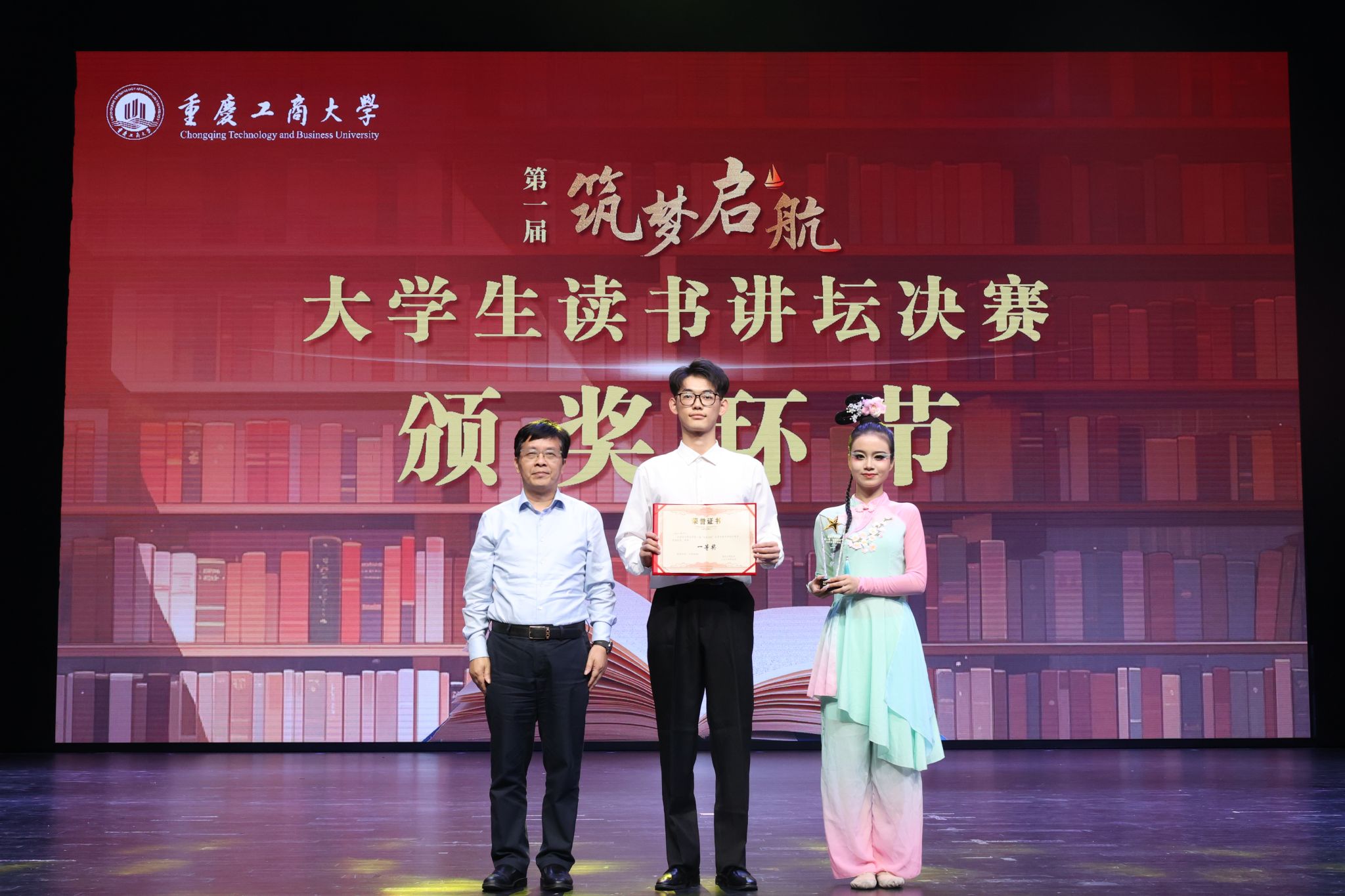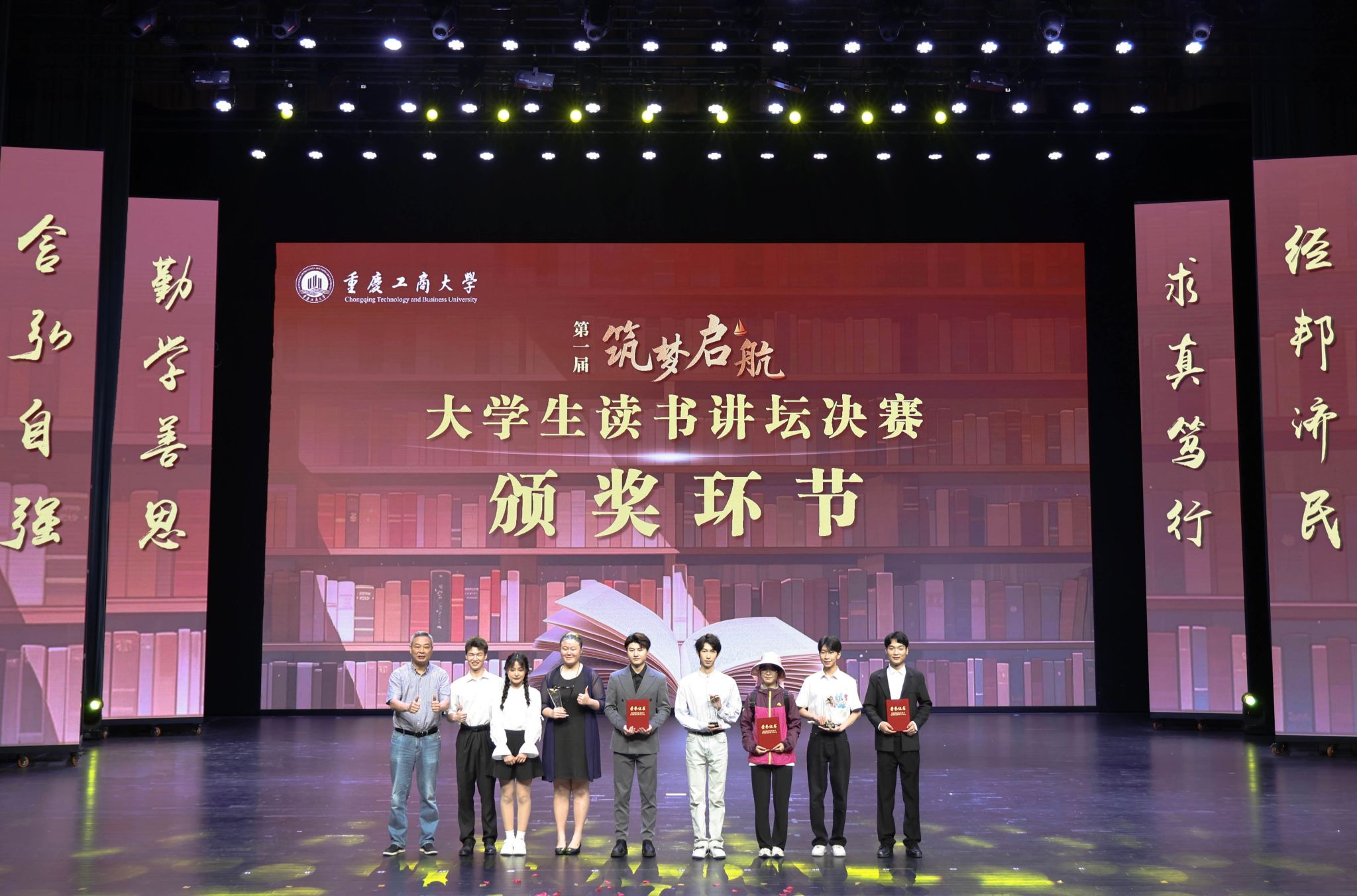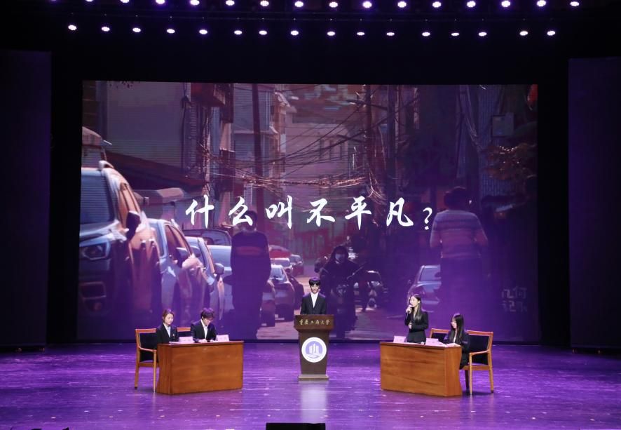 决赛现场,入围的8组队伍采用各具特色的表演形式,演绎出对书籍的热爱和理解,彰显了重工商大学子“爱读书、读好书、善读书“的浓厚氛围。一号队伍《平凡的世界》《觉醒年代》(分享人:尹金叶、高玮丞、胡洋铭、刘佳雪、蒋孟萱)通过辩论表演赛的形式,论证平凡而不平庸,号召青年砥砺奋斗;二号队伍《2021年“一带一路”青年发展报告》(分享人:泰国留学生徐月芬、柬埔寨留学生李安鑫、泰国留学生王雅达)向观众展示“一带一路”倡议为沿线国家带来的崭新面貌和人类命运共同体的宏伟蓝图;三号队伍《我与地坛》(分享人:杜安琪、张金瑞)以史铁生的视角展现出对生命的思考;四号队伍《我们生活在巨大的差距里》(分享人:陈新燃、赵翊彤、徐志科、向照、邓晨鹏)用幽默诙谐的对比展现家庭价值观的衰落和个人主义的兴起对社会的重要影响;五号队伍《江城》(分享人:杨浚杰)描绘了一座外国友人眼里历经变迁而又充满人文关怀城市——涪陵;六号队伍《黄文秀扶贫日记》(分享人:涂烨、吴莉权)用朴实无华的演讲刻画出一个无私奉献,辛勤为民的底层干部;七号队伍《我们仨》(分享人:何驯、古丽努尔·木沙、余冰冰、黄观宇)以第一人称视角将一个家庭的温情故事娓娓道来;八号队伍《蒹葭》(分享人:罗嘉豪、郭渝丹、吕辰露、李春红、蒋可人、吴翔龙、高婉君、杨芮、杨瑷宁)描绘出伊人与君子水岸邂逅的爱情故事。比赛全程激情澎湃、高潮迭起,现场掌声不断。