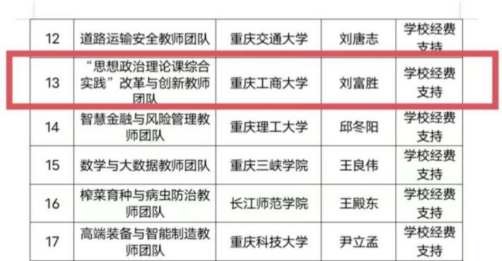近日,重庆市教育委员会公布了第五批重庆市高校“黄大年式”教师团队名单。万象城官网马克思主义学院刘富胜教授领衔的“思想政治理论课综合实践”改革与创新教师团队成功入选。