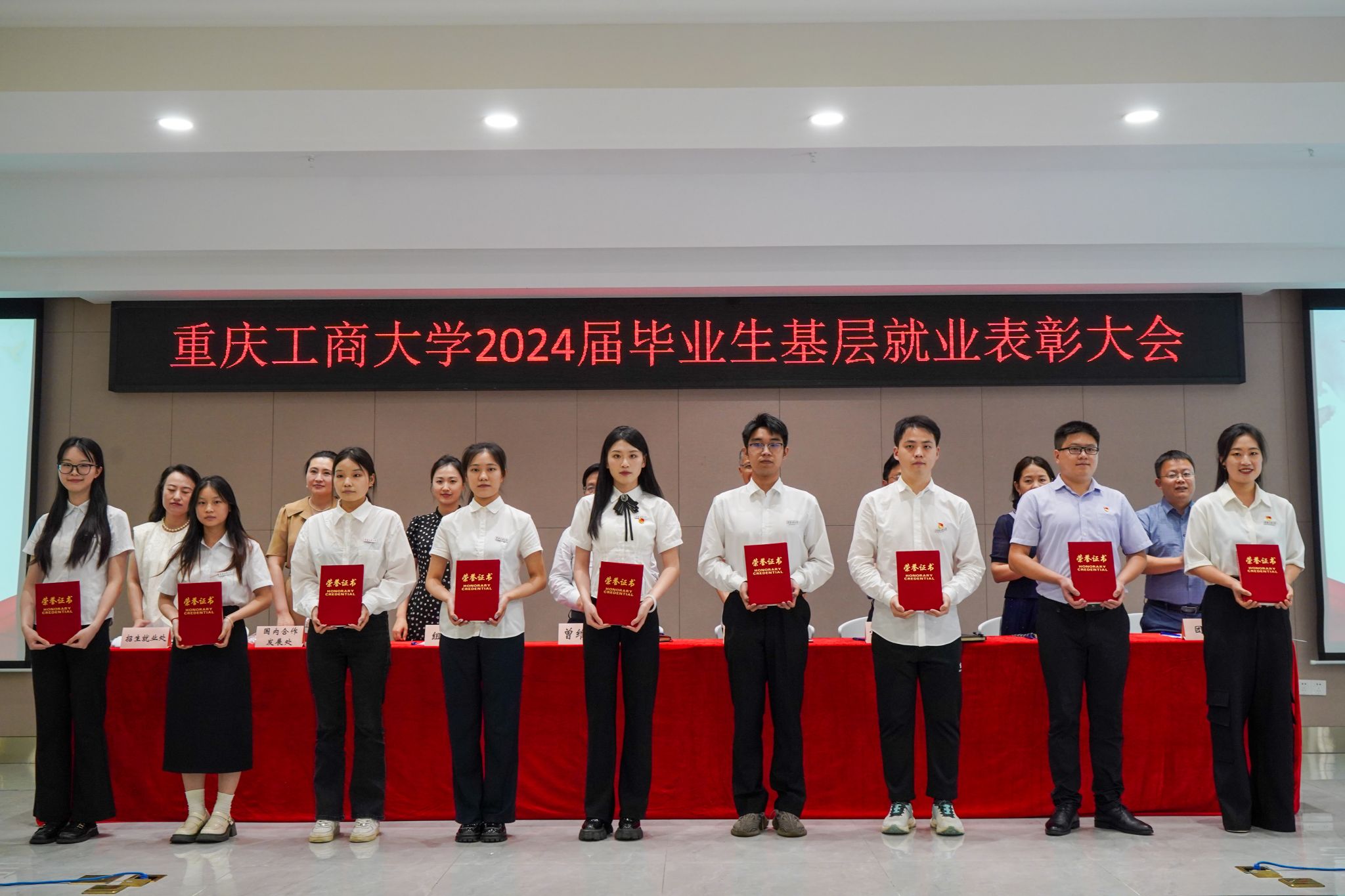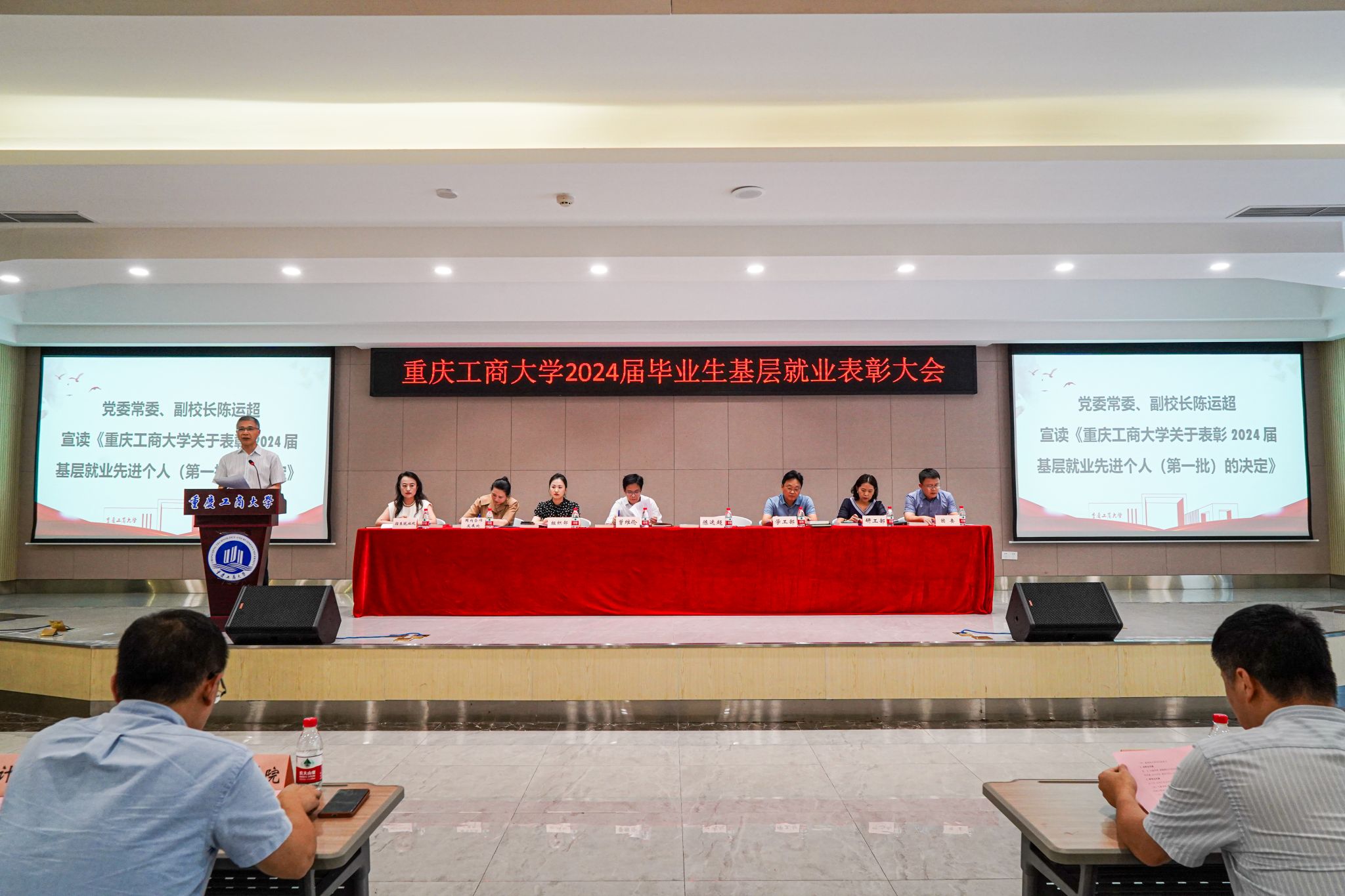 6月18日,万象城官网在学生事务中心B101报告厅召开2024届毕业生基层就业表彰大会,学校党委书记曾维伦,党委常委、副校长陈运超出席会议,组织部、学工部、国内合作发展处、研工部、招生就业处、团委相关负责人,各学院书记、就业联络员、基层就业毕业生代表、在校生代表共计200余人参加会议。会议由招生就业处副处长周婷主持。