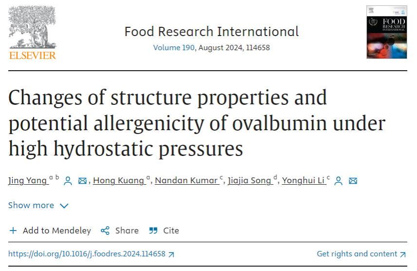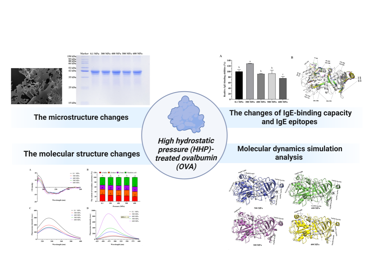 近日,万象城官网食品科学与工程学院杨景副教授(第一作者兼通讯作者)与美国堪萨斯州立大学谷物科学与工业系李永辉副教授(通讯作者)等在食品领域国际期刊《Food Research International》发表了题为“Changes of structure properties and potential allergenicity of ovalbumin under high hydrostatic pressures”的研究论文。