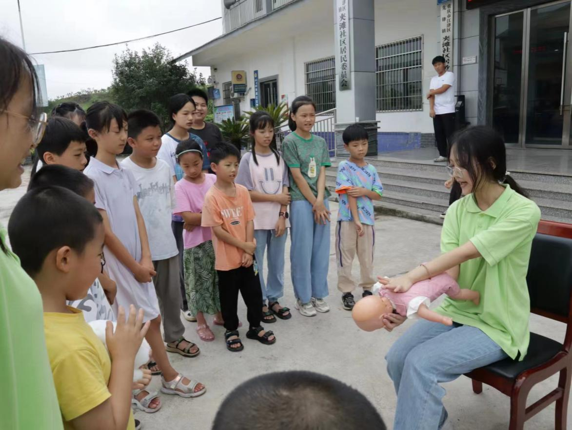 7月8日-7月10日,公共管理学院“小红馨”公共卫生志愿服务团走进江津区先锋镇麻柳村、保坪村和夹滩社区,面向当地村民、青少年儿童开展“科学应急,救在身边”应急救护知识技能培训。志愿者用专业且通俗易懂的方式为村民讲解“六不、两会、四知道”防溺水口诀、心肺复苏法、AED(自动体外除颤仪)正确使用方法以及“海姆立克急救法”,采取“理论+实操”相结合的方式,生动讲解应急知识。培训过程中,志愿者邀请村民和青少年儿童上台,现场指导其进行应急救护操作、模拟应急救护演练,帮助当地居民在实践中逐渐掌握急救操作技能。