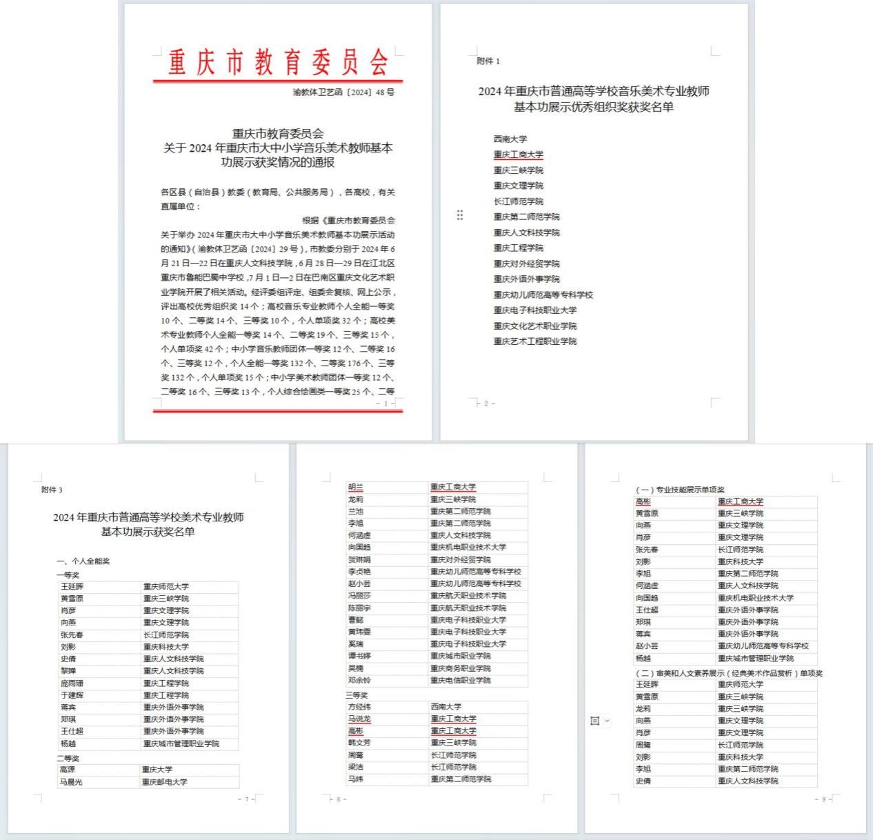 近日,重庆市教育委员会公布了2024年重庆市大中小学音乐美术教师基本功展示获奖名单。万象城官网艺术学院教师胡兰荣获个人全能奖二等奖,马说龙、高彬荣获个人全能奖三等奖,高彬另获单项奖,学校获得“优秀组织奖”。