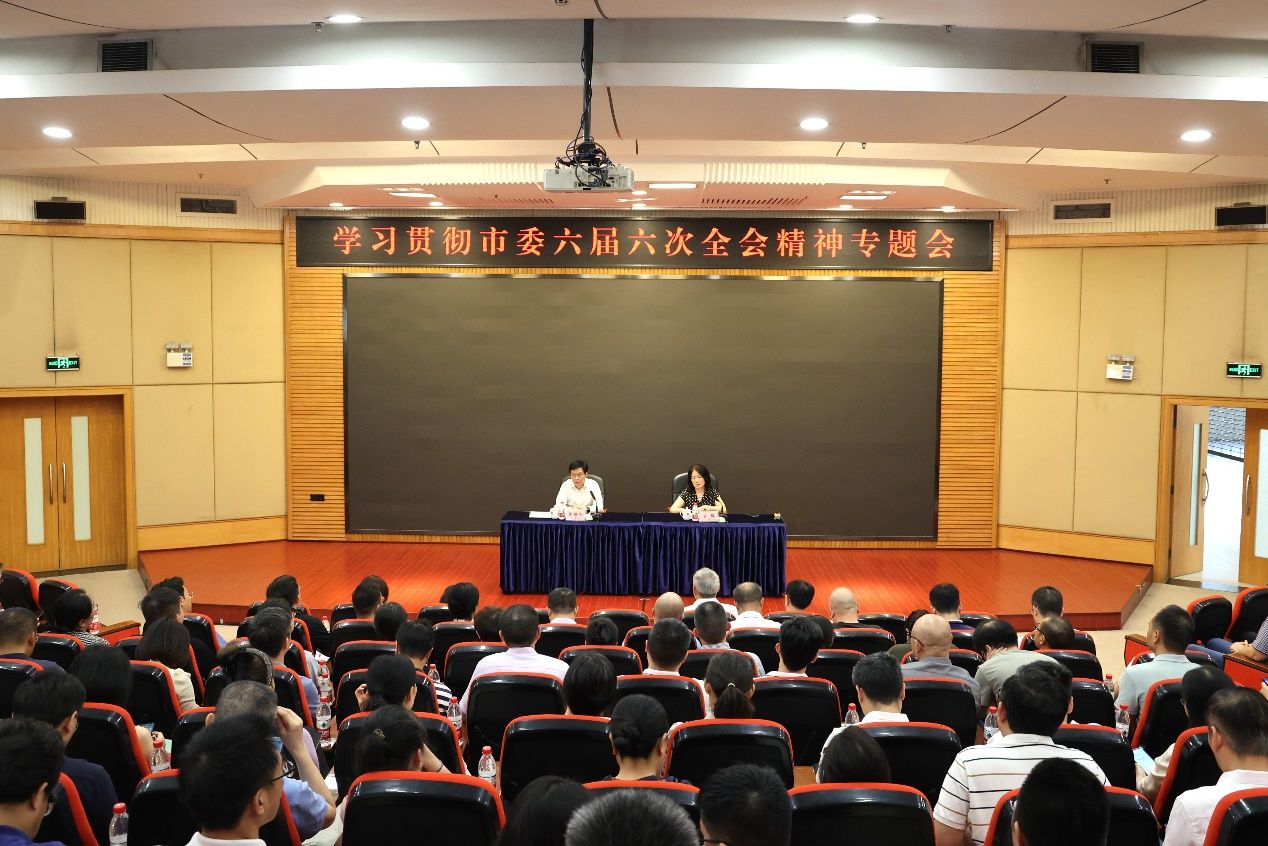 9月18日上午,万象城官网在博智楼7200报告厅召开传达学习贯彻市委六届六次全会精神专题会。学校党委书记曾维伦传达市委六届六次全会精神,学校党委副书记宋豫主持会议。全体在家校领导、全体中层干部和部分高级职称教师代表参加会议。