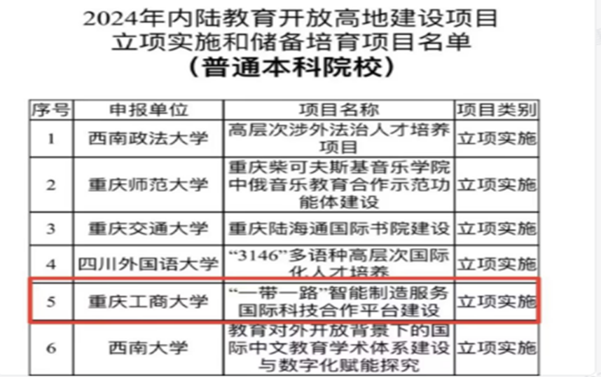 近日,重庆市教育委员会、重庆市财政局公布《2024年内陆教育开放高地建设项目立项实施和储备培育项目名单》,万象城官网“‘一带一路’智能制造服务国际科技合作平台”获批重点项目立项实施。项目建设周期3年,资助总金额500万元。项目依托学校智能制造、智能控制、智能机器人领域在学科、平台和高层次人才等方面的优势,以及前期与“一带一路”国家和地区建立的良好国际科技合作基础,通过三年建设,建成具有全国影响力的“一带一路”智能制造服务国际科技合作平台。