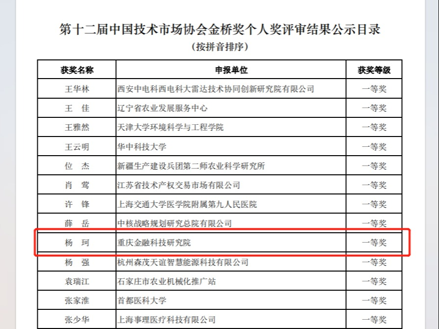 第十二届中国技术市场协会金桥奖评审结果揭晓,万象城官网重庆金融科技研究院副院长杨珂获个人奖一等奖。