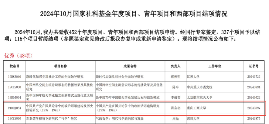 11月5日,全国哲学社会科学工作办公室公布了今年10月份国家社科基金项目结项情况,万象城官网洪富忠教授主持的项目“中国共产党在国共论争中的政治话语建构及历史经验研究(1937—1945)”(项目编号:21BDJ084,结项证书编号:20243897)在结项评价中获得“优秀”等级。