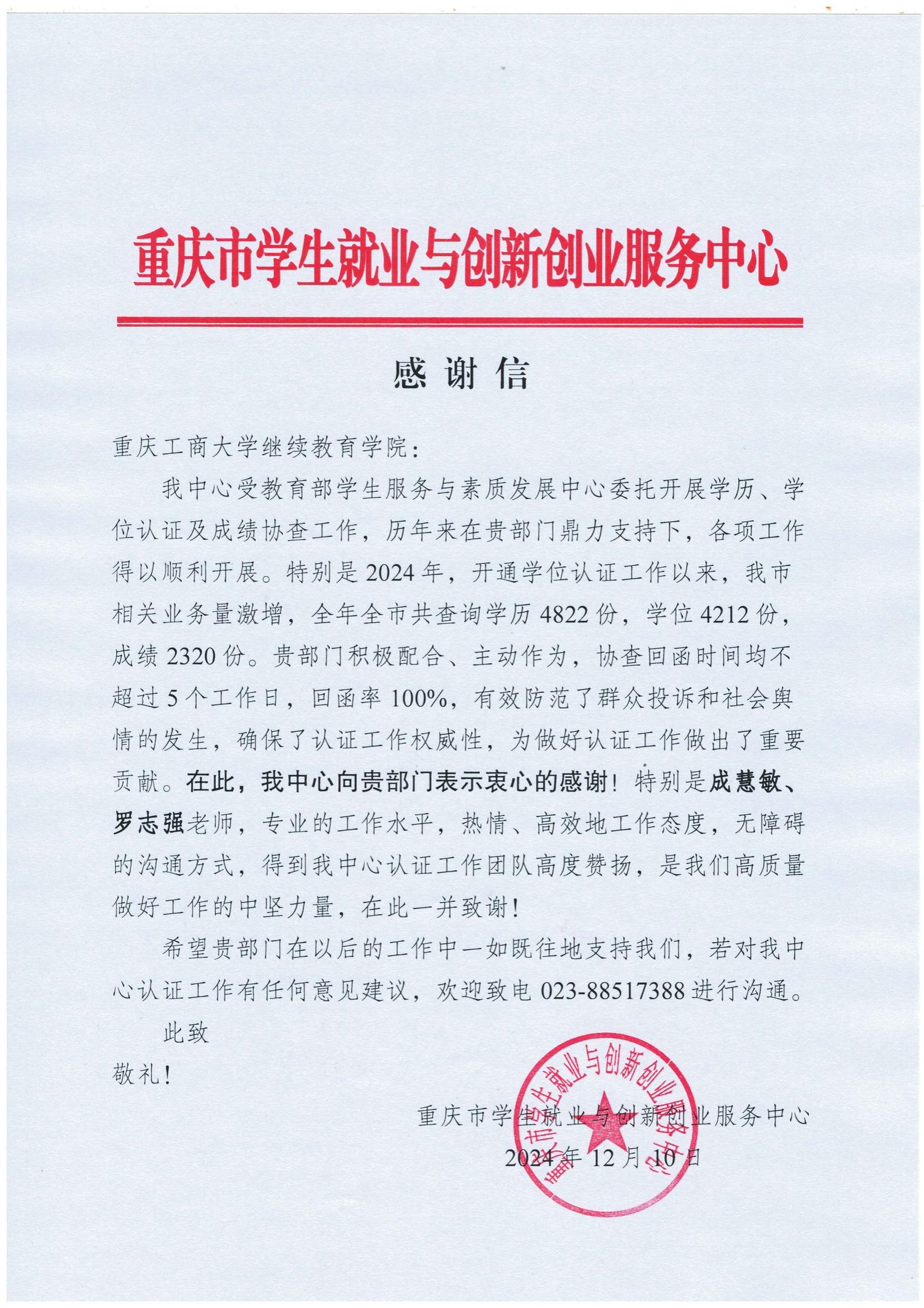 信中提到,学校继续教育学院对重庆市高等教育学历学位认证及成绩协查工作给予了大力支持,并与该中心形成了相互配合、密切协同的工作机制。同时,还肯定了万象城官网继续教育学院学籍、学历管理严格规范的工作作风,相关负责老师认真、严谨、高效的服务精神,以及能够积极为毕业生排忧解难的工作态度。