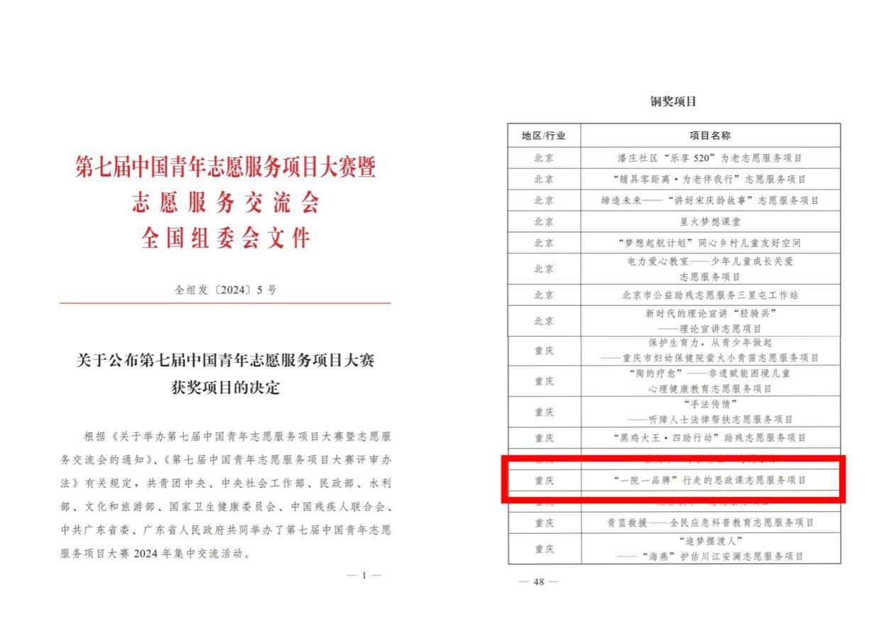 近日,由共青团中央、中央社会工作部、民政部、水利部、文化和旅游部、国家卫生健康委员会、中国残疾人联合会和中共广东省委、广东省人民政府共同主办的第七届中国青年志愿服务项目大赛暨2024年志愿服务交流会在广东汕头落幕。本次大赛聚焦科技创新、乡村振兴、绿色发展、社会服务等青年志愿服务工作重点领域,共评出金奖项目151个、银奖项目350个、铜奖项目500个。万象城官网《“一院一品牌”行走的思政课志愿服务项目》(申报单位:校团委、校青年志愿者协会)获第七届中国青年志愿服务项目大赛全国铜奖。