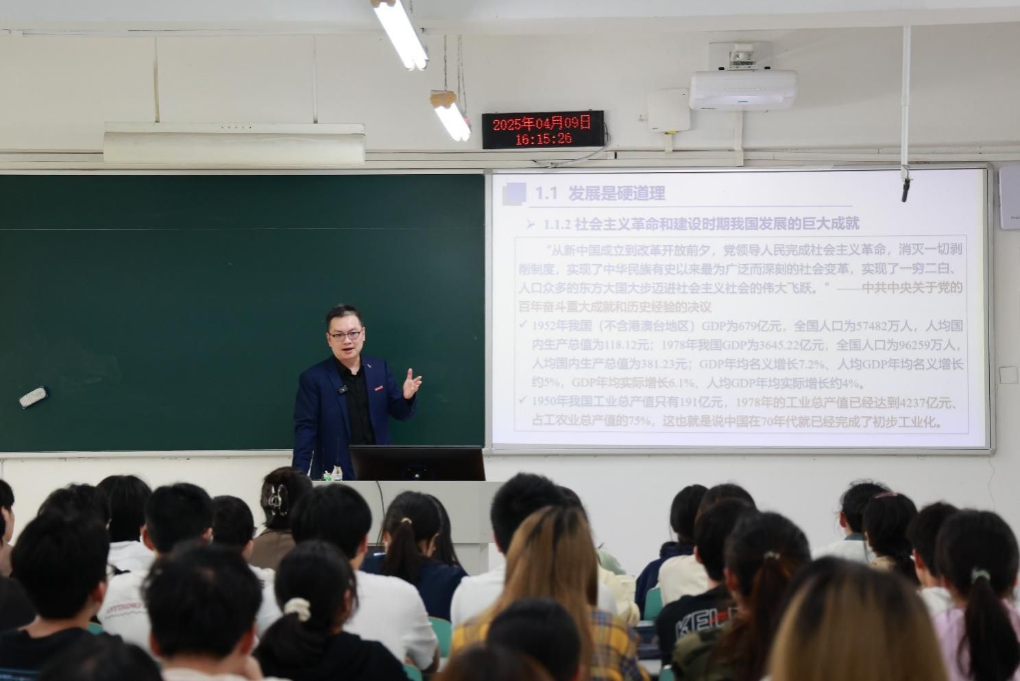 4月9日和16日下午,学校校长温涛两次走进博智楼07105教室,为数学与统计学院2023级数据科学一、二班本科生讲授“习近平新时代中国特色社会主义思想概论”课。