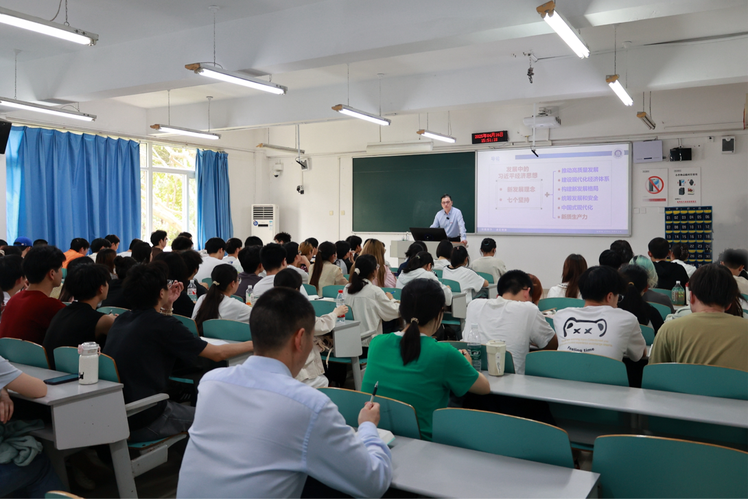 课堂上,温涛结合丰富的案例和数据,融会贯通、深入浅出地为同学们讲授了一堂精彩纷呈、启人心智的思政课。温涛说,习近平经济思想是习近平新时代中国特色社会主义思想的重要组成部分,是马克思主义政治经济学在当代中国、21世纪世界的最新理论成果,是我国经济高质量发展、全面建设社会主义现代化国家的科学指南。自党的十九大报告提出我国经济转向高质量发展阶段后,2017年12月召开的中央经济工作会议首次明确提出并阐述习近平新时代中国特色社会主义经济思想。温涛进一步讲到,实现高质量发展要坚持和完善社会主义基本经济制度,全面贯彻新发展理念,构建新发展格局,建设现代化经济体系,发展新质生产力,深化供给侧结构性改革,统筹扩大内需,实现高水平自立自强。同时,要以稳中求进工作总基调为指引,坚持底线思维、系统观念,确保党对经济工作的全面领导,为社会主义现代化强国建设保驾护航。