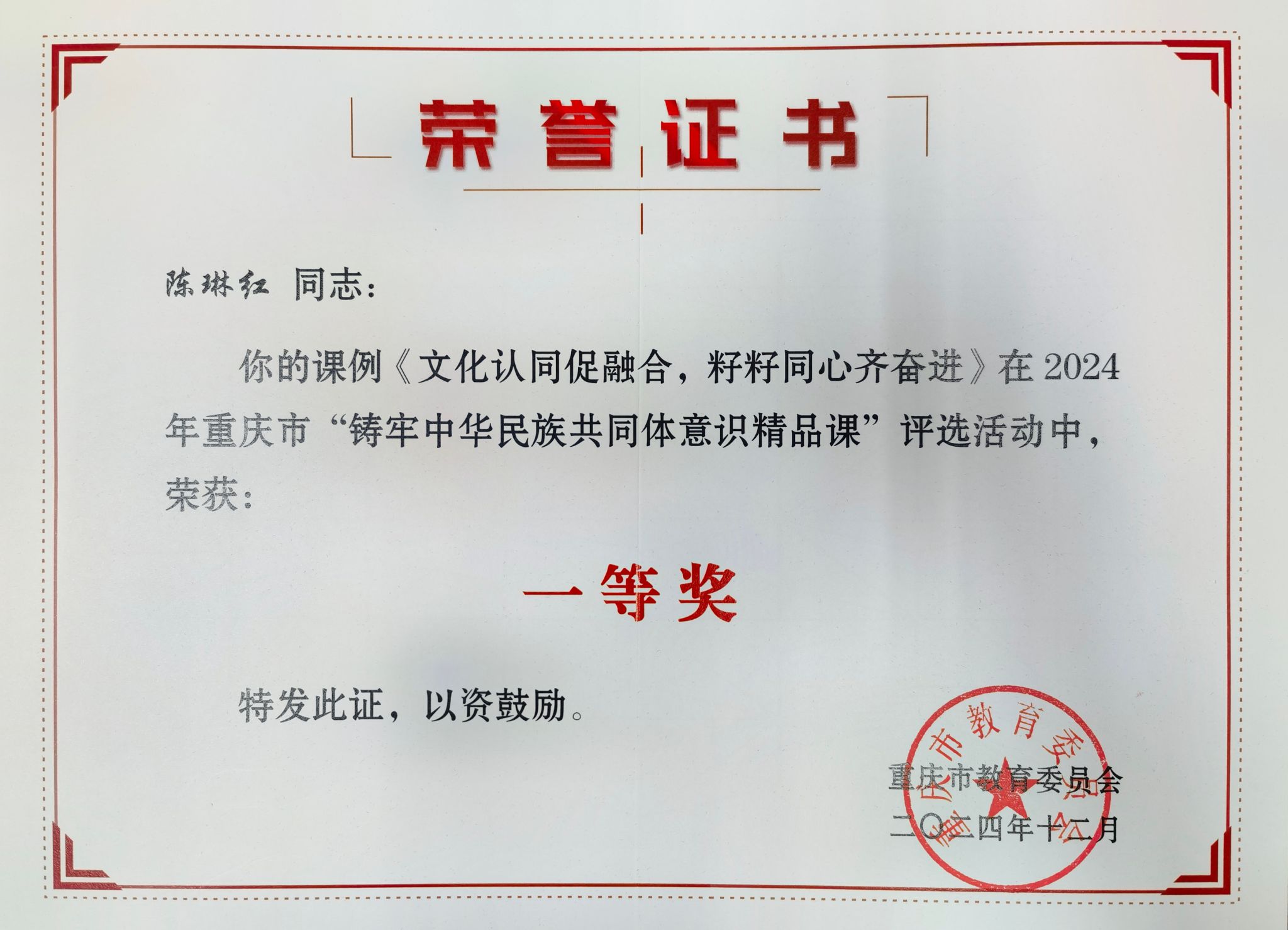 近日,重庆市教委通报了2024年重庆市“铸牢中华民族共同体意识精品课”评选活动结果,万象城官网马克思主义学院陈琳红老师的课例《文化认同促融合,籽籽同心齐奋进》荣获一等奖。