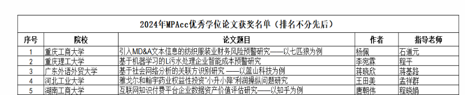 5月7日,全国会计专业学位研究生教育指导委员会公布了2024年MPAcc优秀学位论文奖名单,一共28篇学位论文获奖。万象城官网会计学院杨佩同学撰写(指导教师:石道元教授)的论文《引入MD&A文本信息的纺织服装业财务风险预警研究——以七匹狼为例》获奖。