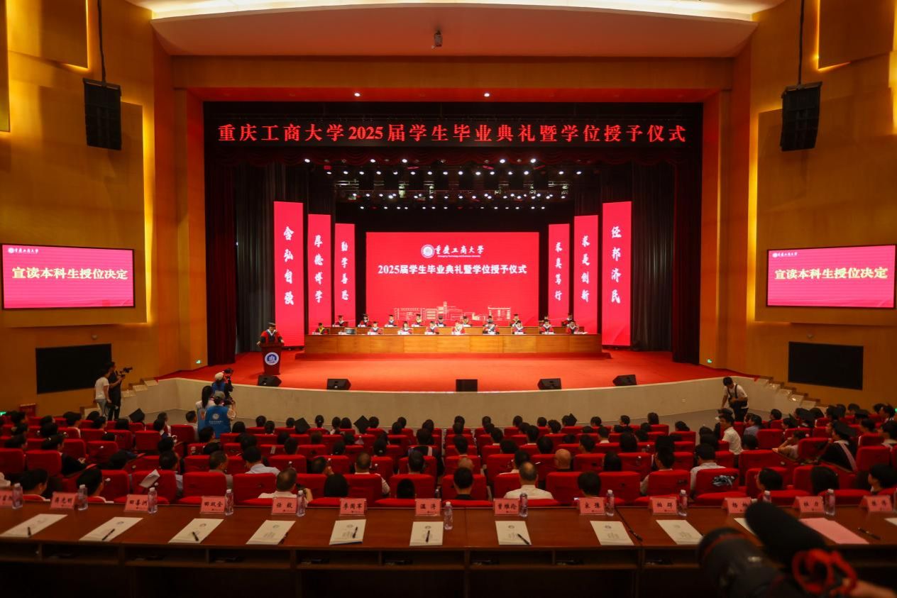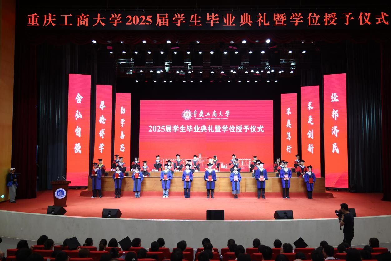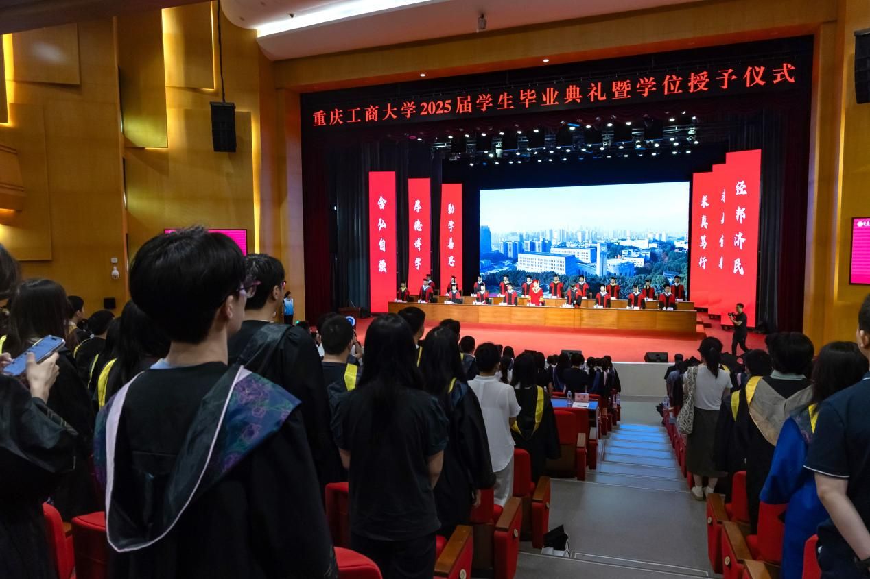 青衿暂别,玉宇长歌。6月19日上午,学校在南岸校区剧场举行2025届学生毕业典礼暨学位授予仪式。 2025届共有6015名本科生、1416名硕士研究生、21名博士研究生和14名留学生顺利获得了学位,开启人生崭新篇章。校长温涛以“在不确定的世界,做确定的自己”为题为毕业生们上在重工商大的“最后一课”。
