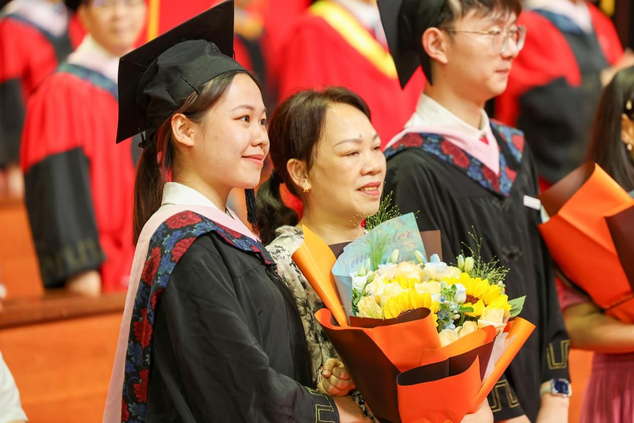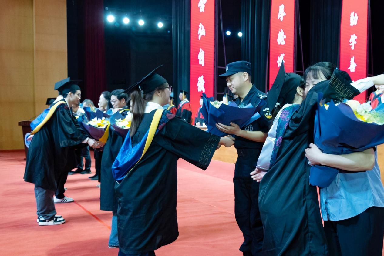 成长路上,父母如同无声的灯塔,用包容的目光照亮每一段旅程。毕业生代表为父母送上鲜花和拥抱,感恩父母的养育之恩。看着儿女学有所成,不少家长眼中噙满泪花,岁月在他们鬓角染上的霜雪、眼角刻下的纹路,此刻都成了爱的勋章。泪光与笑容交织中,那些未曾言说的深情,都化作了最动人的告白。