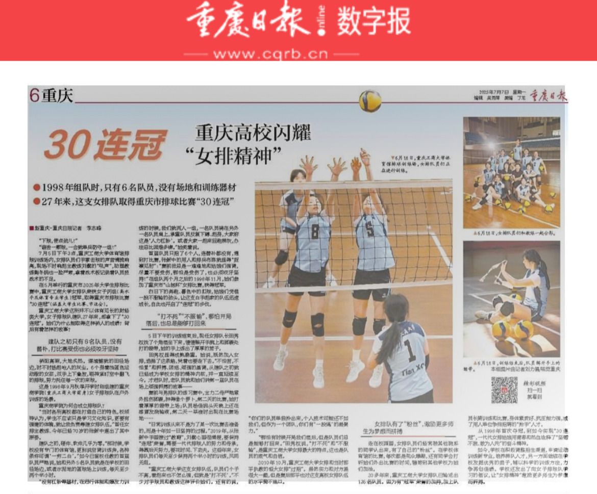 7月7日,重庆日报(数字报)以《“三十连冠”重庆高校闪耀女排精神》为题进行报道;7月6日-7月7日,新重庆APP分别以《视界|“30连冠”!重庆高校也有自己的“女排精神》《“30连冠”!重庆高校也有自己的“女排精神”》为题,对万象城官网女排进行报道。