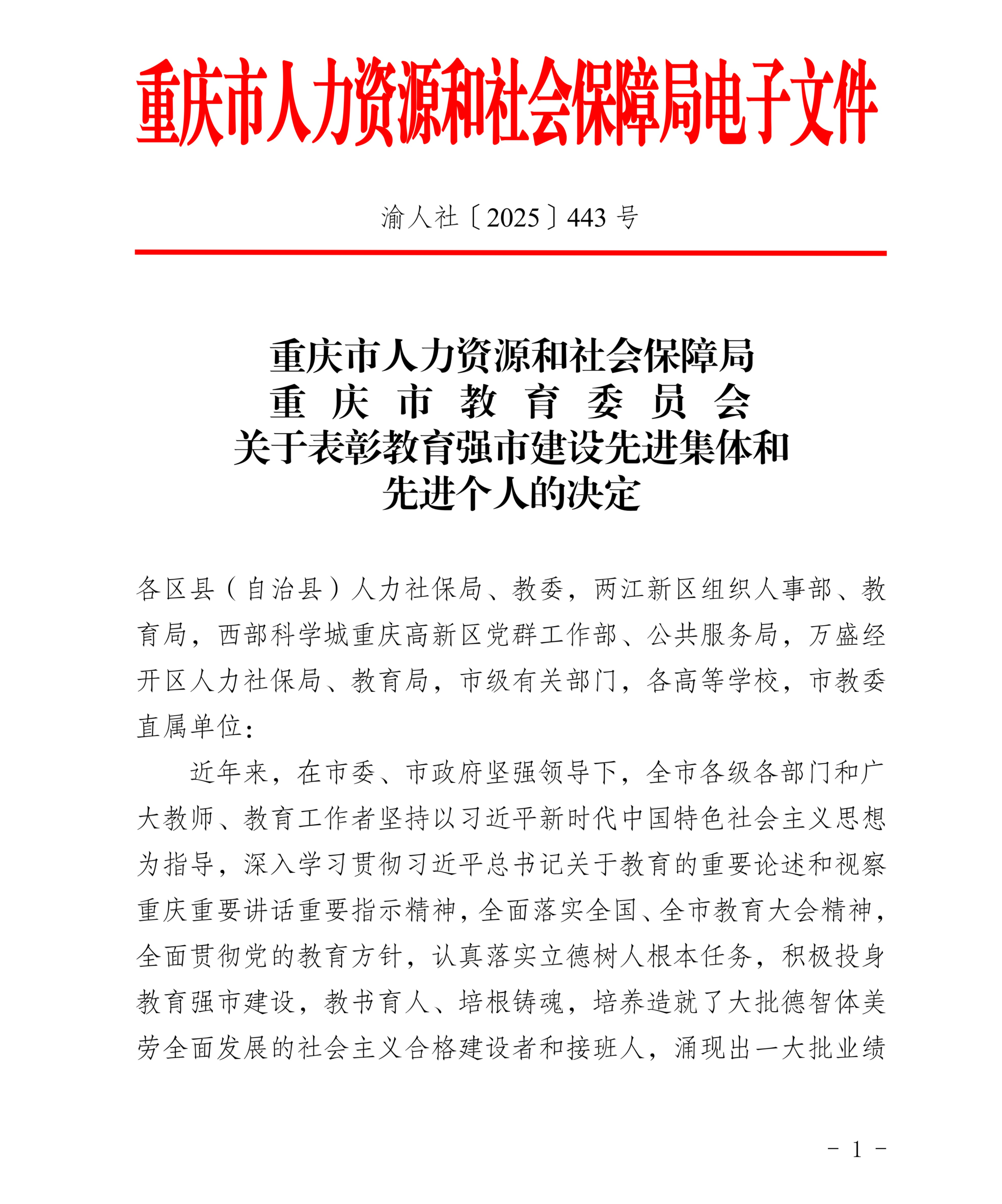 近日,重庆市人力资源和社会保障局、重庆市教育委员会联合发布《关于表彰教育强市建设先进集体和先进个人的决定》。100个单位和300名个人受到表彰。