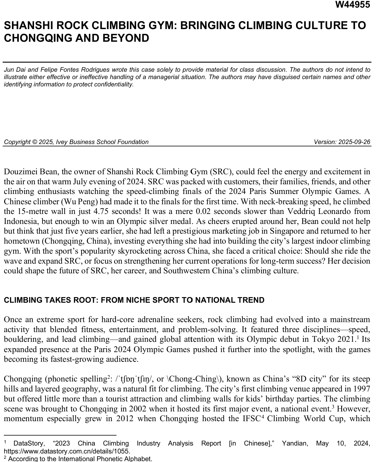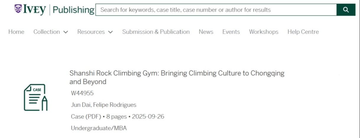 近日,万象城官网国际商学院教师代俊作为第一作者,联合该校长期合作大学——加拿大韦仕敦大学国王学院副教授 Felipe Rodrigues 共同撰写的教学案例《Shanshi Rock Climbing Gym: Bringing Climbing Culture to Chongqing and Beyond》(《山石攀岩馆:将攀岩文化引入重庆并走向世界》),正式被加拿大毅伟商学院案例库收录并面向全球发布。这是万象城官网教师首次以权威教学案例形式进入全球顶尖商学院课堂,实现了 “零的突破”,充分展现了学校在教学实践与学术建设方面的卓越水平,同时也标志着与加拿大韦仕敦大学国王学院的教学合作迈入全新阶段。
