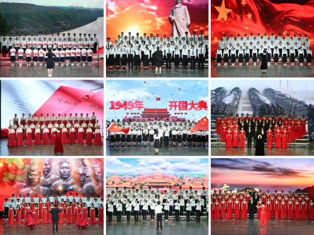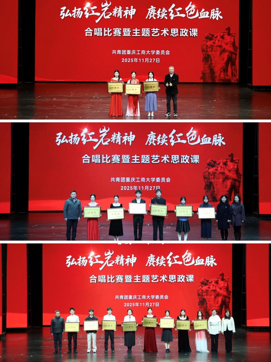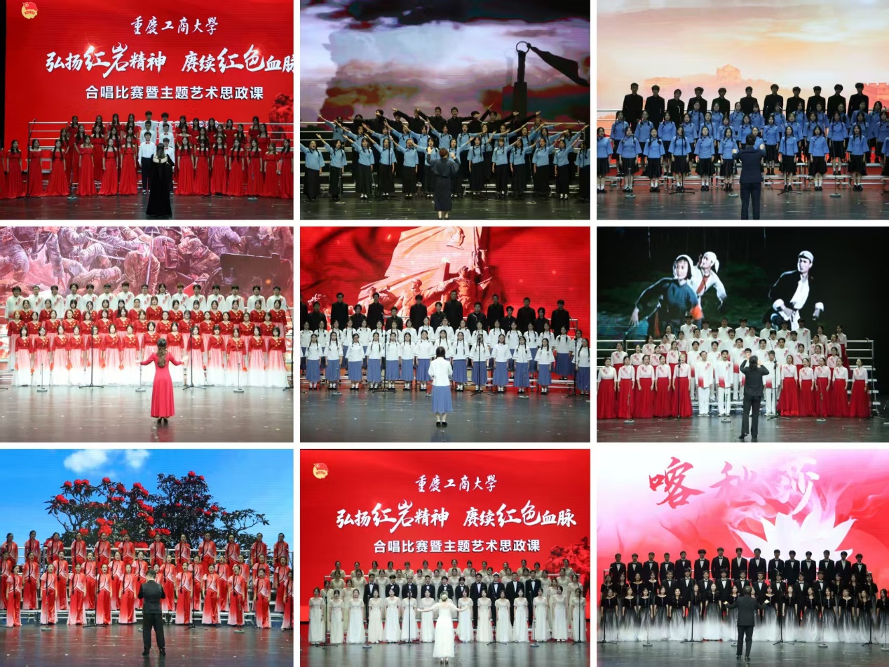 比赛现场,18个学院的学生合唱队齐聚一堂,用歌声致敬革命先烈,让红色血脉在青春接力中赓续传承。活动分为四个篇章。“山河破碎·烽火觉醒”篇章拉开序幕,《松花江上》的悲怆、《在太行山上》的激昂、《长城谣》的深情与《保卫黄河》的怒吼,再现了民族危亡时刻的抗争和觉醒。“众志成城·保卫家园”篇章中,《五月的鲜花》的号召,《游击队歌》展现智慧,《映山红》期盼黎明,而《啊,朋友再见》与《喀秋莎》唱响守望与向往。随着《延安颂》《东方红》的颂歌,活动进入“胜利荣光·薪火永传”篇章,《英雄赞歌》气壮山河,《唱支山歌给党听》情深意切。在“红岩铸魂·筑梦征程”篇章中,从《没有共产党就没有新中国》的真理强音,到《祖国不会忘记》的无名丰碑,再到《在灿烂阳光下》的感恩奋进,《我们都是追梦人》的青春誓言,最终凝聚于《不忘初心》的庄严承诺。尾声一曲《红梅赞》,以红岩上傲然绽放的红梅意象,将坚贞不屈、斗争到底的红岩精神升华,激励青年学子在新时代的筑梦征程上奋勇前行。