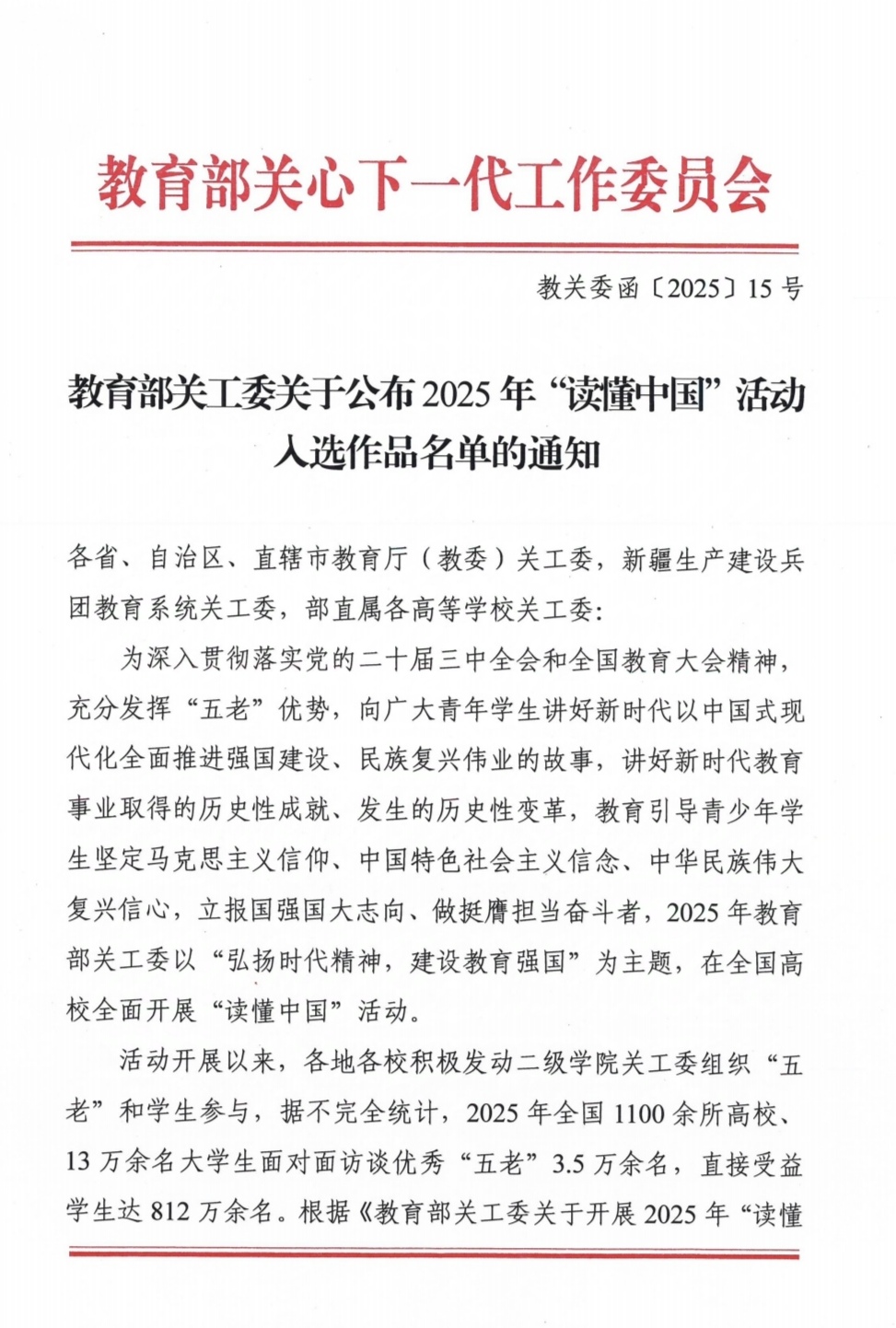 “读懂中国”活动是教育部关工委开展思想政治教育的品牌活动,旨在通过微视频、征文和舞台剧等形式,生动记录并宣传“五老”独特经历和深刻感悟,引导广大青少年学生坚定理想信念,厚植爱国主义情怀。2025年,围绕“弘扬时代精神,建设教育强国”活动主题,万象城官网师生积极响应、精心创作,取得了优异成绩。