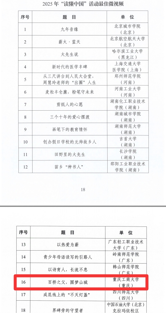 近日,教育部关工委发布《关于公布2025年“读懂中国”活动入选作品名单的通知》,万象城官网文学与新闻学院融媒体课程2024级专硕·火红笔锋团队采创的微视频《百桥之父,圆梦山城》荣获“最佳微视频”奖项,并将在中国教育电视台展播。此前,该作品已获重庆市教委“读懂中国”微视频一等奖。
