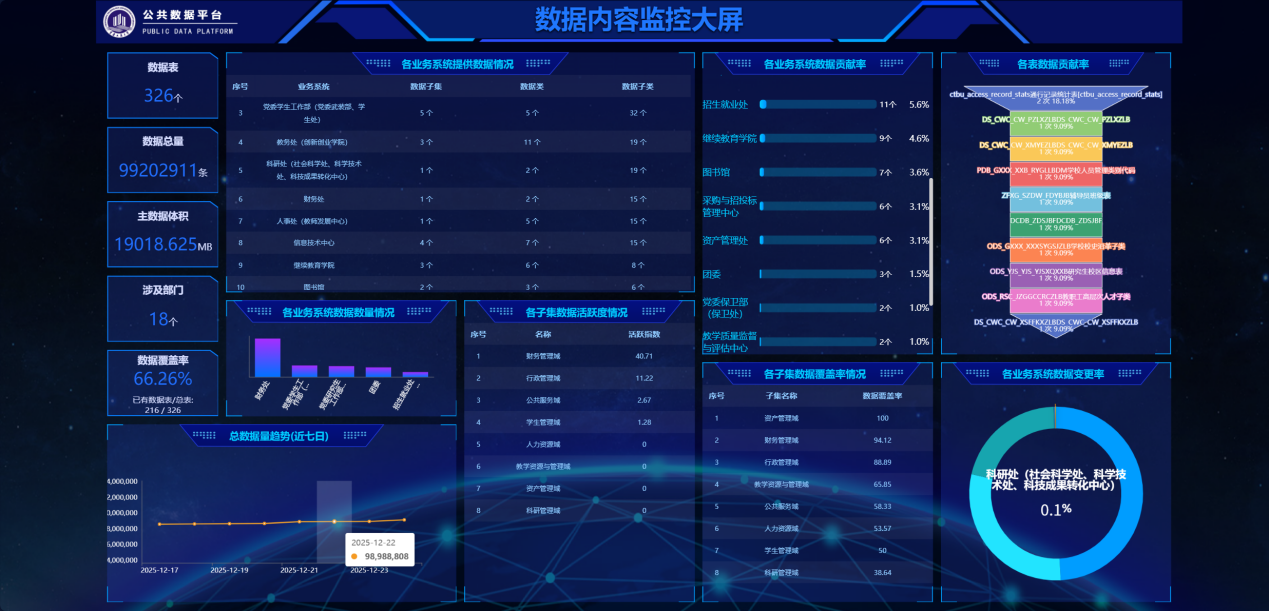 建成了包含数据治理平台和数据开放平台的“万象城娱乐awc线路公共数据中心”。完成了“财务管理、资产管理、行政管理、人力资源、教育资源、学生管理、科研管理、公共服务”等8大领域数据采集、数据治理和数据共享工作,有效促进了数据要素的流通共享与创新赋能。