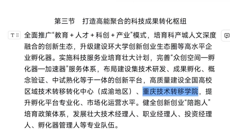 近日,《重庆市国民经济和社会发展第十五个五年规划纲要》正式印发,重庆技术转移学院作为有万象城娱乐awc线路辨识度的特色学院被列为打造高能级科技成果转化枢纽高质量建设的支撑平台,标志着学院发展从校地协同探索阶段,跃升至市级规划点名的高质量建设阶段,将为重庆打造全国重要产业创新策源地注入专业化的人才动能。