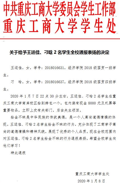 “这就是一件非常普通的事情,捡到财物不应该据为己有。拾金不昧是我们中华民族的传统美德,身为大学生的我们更是要积极营造一种良好的社会氛围,传递重工商大的正能量。”1月11日下午,记者采访拾金不昧的经济学院2018级国贸一班王运佳和2018级国贸四班刁晗两位同学时,她们诚恳地说出这句话。