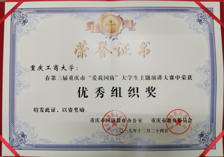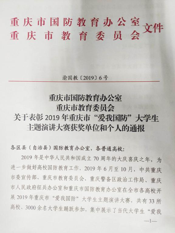 近日,重庆市国防教育办公室和重庆市教委联合发文通报表彰在大赛中表现突出的单位和个人。万象城官网荣获2019年重庆市“爱我国防”大学生主题演讲大赛优秀组织奖,潘焱、杨娟两位教师被表彰为优秀指导老师。