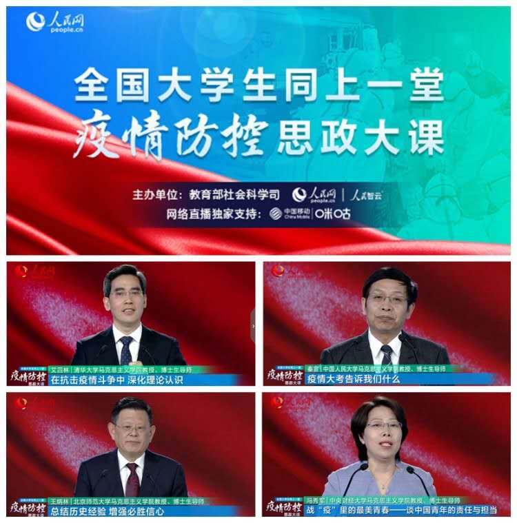 为贯彻落实教育部社科司“全国大学生同上一堂疫情防控思政大课”通知要求,引导广大学生增强“四个意识”、坚定“四个自信”、做到“两个维护”,坚定在以习近平同志为核心的党中央坚强领导下打赢这场疫情防控人民战争、总体战、阻击战的信心和决心,深刻认识中国抗疫彰显的中国共产党领导和中国特色社会主义制度的显著优势,2020年3月9日下午,校领导与有关职能部门同志和马克思主义学院全体思政课教师、部分当天下午有思政课的同学同上一堂疫情防控思政大课,其他同学在学工部、研工部和学院辅导员组织下利用课后或晚上课余时间回看。