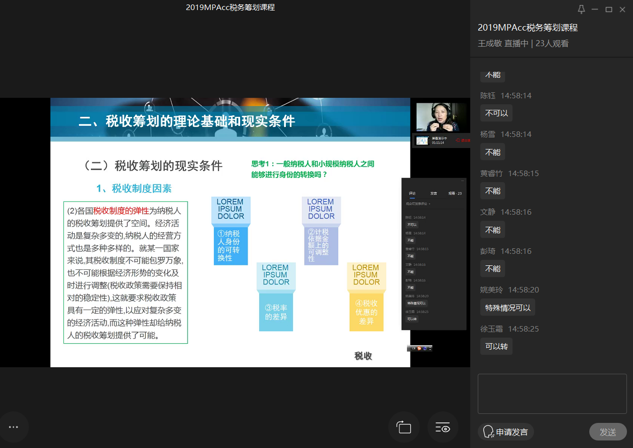 为确保在线教学安全平稳运行,MPAcc教育中心严格执行网络教学安全规范,一是开课前3周需要提交教学准备材料进行审核把关;开课前2周通过网络会议形式传达教学注意事项,开课前一周进行网络教学平台调试;二是依托企业微信,MPAcc教育中心组建网络课程班级,授课期间通过分享课程链接邀请其他人加入课堂听课;三是要求做好教师网络授课素材的收集工作(如教师网络上课照片、教师上传的教学资料截图、学生学习报告、教师的授课报告等);四是直播过程中注意立德树人,课程思政的引导。