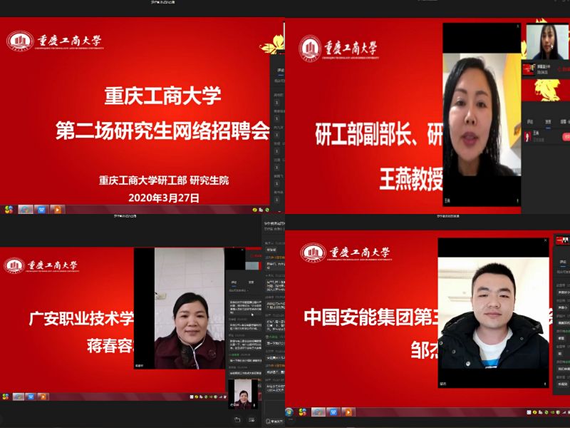 继万象城官网研究生网络专场招聘系列活动启动以来,得到了用人单位与毕业研究生的一致好评。为持续推进万象城官网毕业研究生就业精准帮扶工作深入开展,3月27日下午,第二场研究生网络专场招聘活动通过企业微信平台顺利举办。本场招聘会邀请到重庆德感科技创业投资有限公司、中国安能集团第三工程局、广安职业技术学院,三家单位为万象城官网研究生量身定做提供了包含行政职能、财会审计、企业管理等40余个岗位。研工部副部长、研究生院副院长王燕教授、重庆德感科技创业投资有限公司董事长罗其胜先生、中国安能集团第三工程局人力资源部邹杰先生、广安职业技术学院办公室主任蒋春容老师参加了此次招聘会。