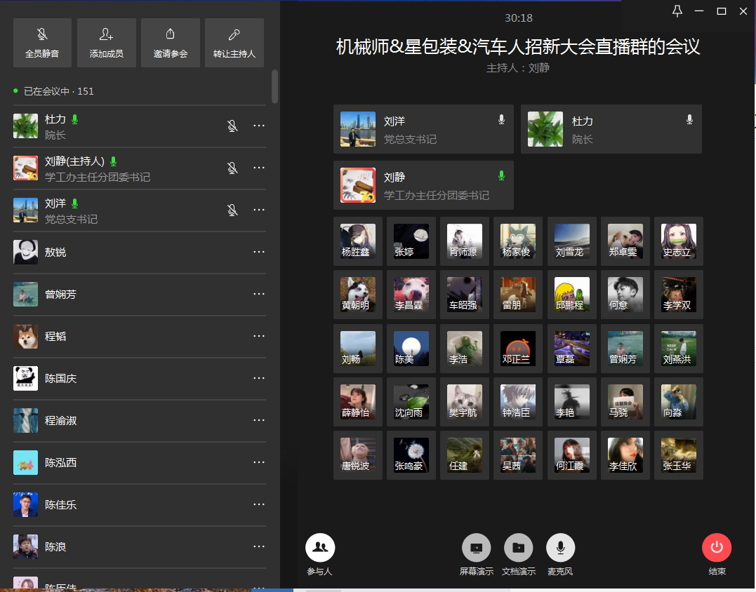 2020年4月3日,机械工程学院第五届“团队伴我成长”招募活动在线上召开,学院刘洋书记、杜力院长,学工办主任刘静、工程训练中心刘雪龙老师和学院2019级近200学生参加了此次招募活动,新生参与人数占2019级学生的近60%。招募活动由刘静主持。