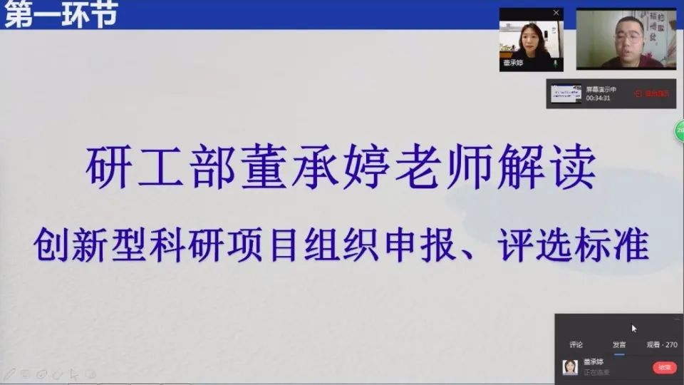 为帮助各研究生了解创新型科研项目申报的相关事项,研工部董承婷老师有针对性的从创新型科研项目的组织流程、评审标准、资助经费及结题要求等方面为大家进行详细解读,为大家展示了往年优秀课题申报范例。