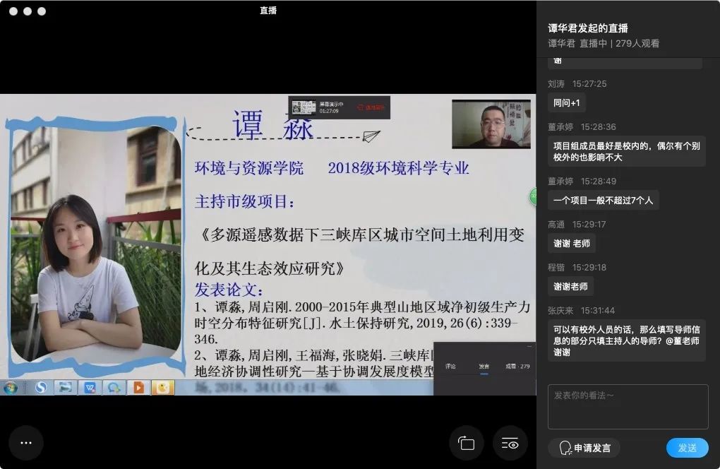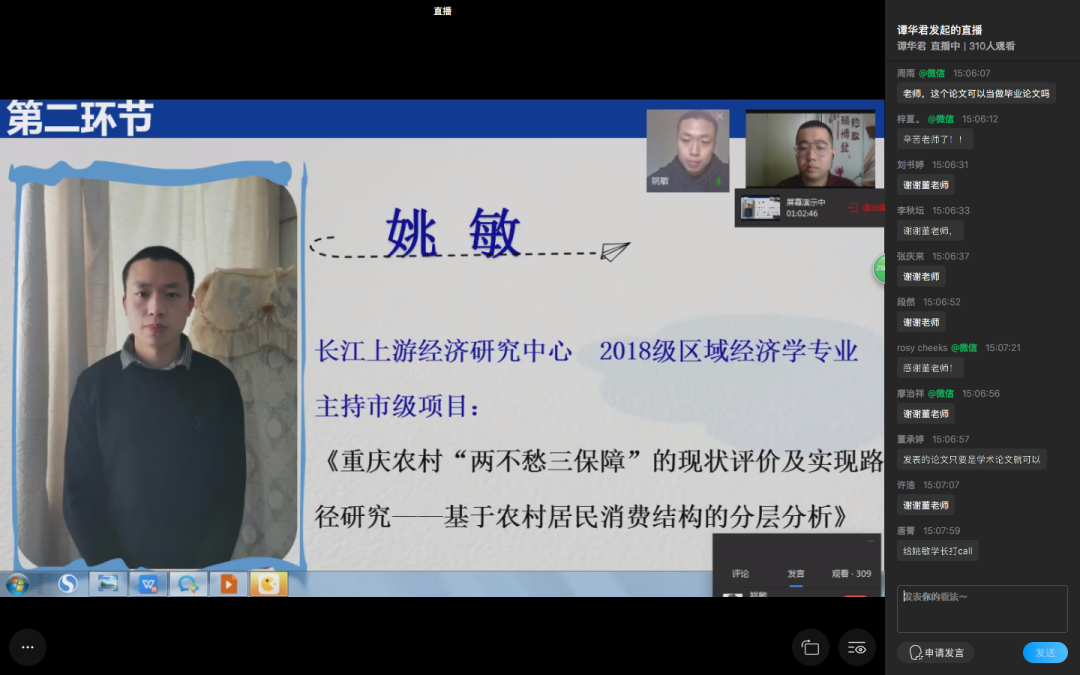 本次沙龙邀请了往届成功申报研究生创新型科研项目的同学为大家进行申报经验分享。来自长江上游经济研究中心2018级区域经济学专业的姚敏结合自身申报经历,从项目选题、申报书的撰写和结题规划三个方面进行交流。姚敏学长多次强调了和导师积极沟通的重要性,他认为导师可以从更高的层面为我们的选题进行指导。来自环境与资源学院2018级环境科学专业的谭淼以申报书撰写规范、创新点挖掘、构建研究思路、技术路线图设计为内容做交流。她谈到大量阅读文献的重要性,鼓励同学们多与团队成员保持密切的学术沟通交流,做到精益求精。