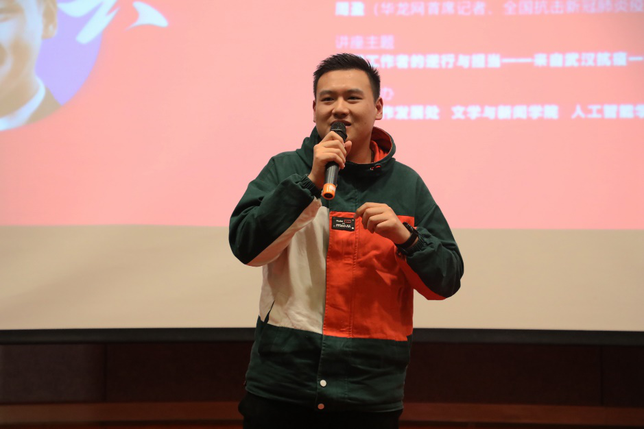 谢智强是重庆日报首席记者。年初,新冠病毒肆虐湖北时,他冲在抗疫一线,在武汉生活了62天,完成了219篇新闻作品。讲座伊始,谢智强分享了由他策划的《战疫前线医护人员吐心声:疫情结束后,我最想……》系列视频报道从策划到拍摄的全过程,通过一组组镜头将医务工作者的内心世界展现出来,相关作品迄今已获近5亿次的播放量。采访过程虽困难重重,但谢智强认为,无论条件如何恶劣,新闻工作者最终呈现的新闻作品也应能与作品下的署名匹配。谢志强分享了从业经验。他认为,新闻作品呈现不完美,是因为新闻工作者离新闻源不够近。他提出三个问题让在场听众思考,一是什么是新闻记者的责任,二是记者创作的新闻作品在记录什么,三是创作的新闻作品有何意义。同时,他希望同学们把对学新闻的向往变成对学新闻的动力,夯实基础,不断地丰富提升自己,从业路上遵守新闻工作者的职业道德规范。