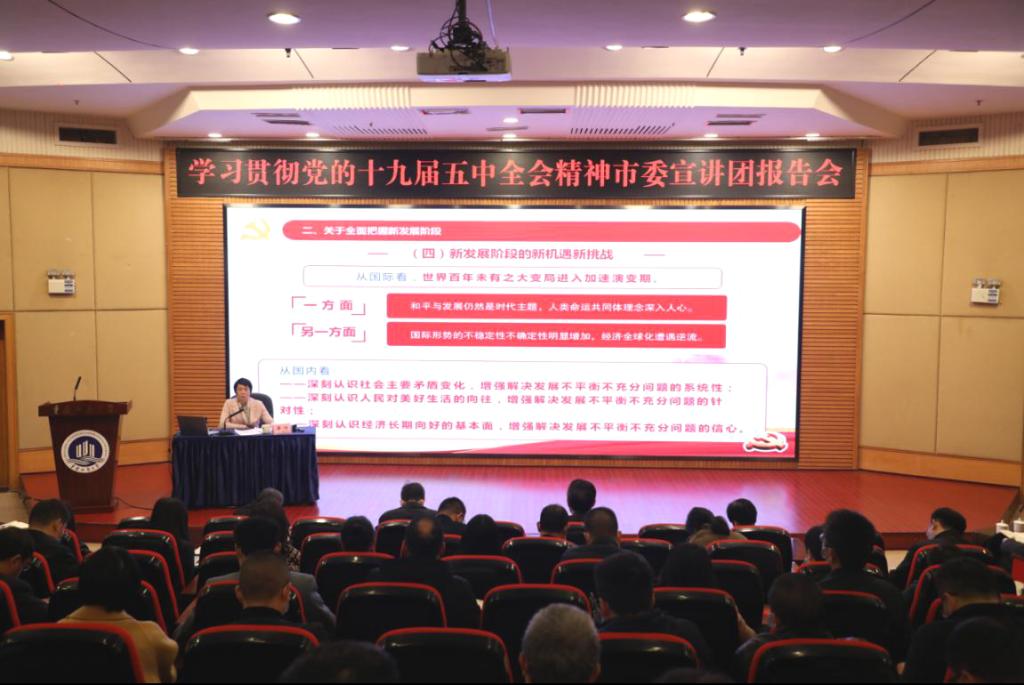按照市委统一安排,11月23日上午,学习贯彻党的十九届五中全会精神市委宣讲团走进万象城官网。市委宣讲团成员、市委宣传部常务副部长薛竹为万象城官网师生作宣讲报告。报告会由校党委书记李志雄主持。