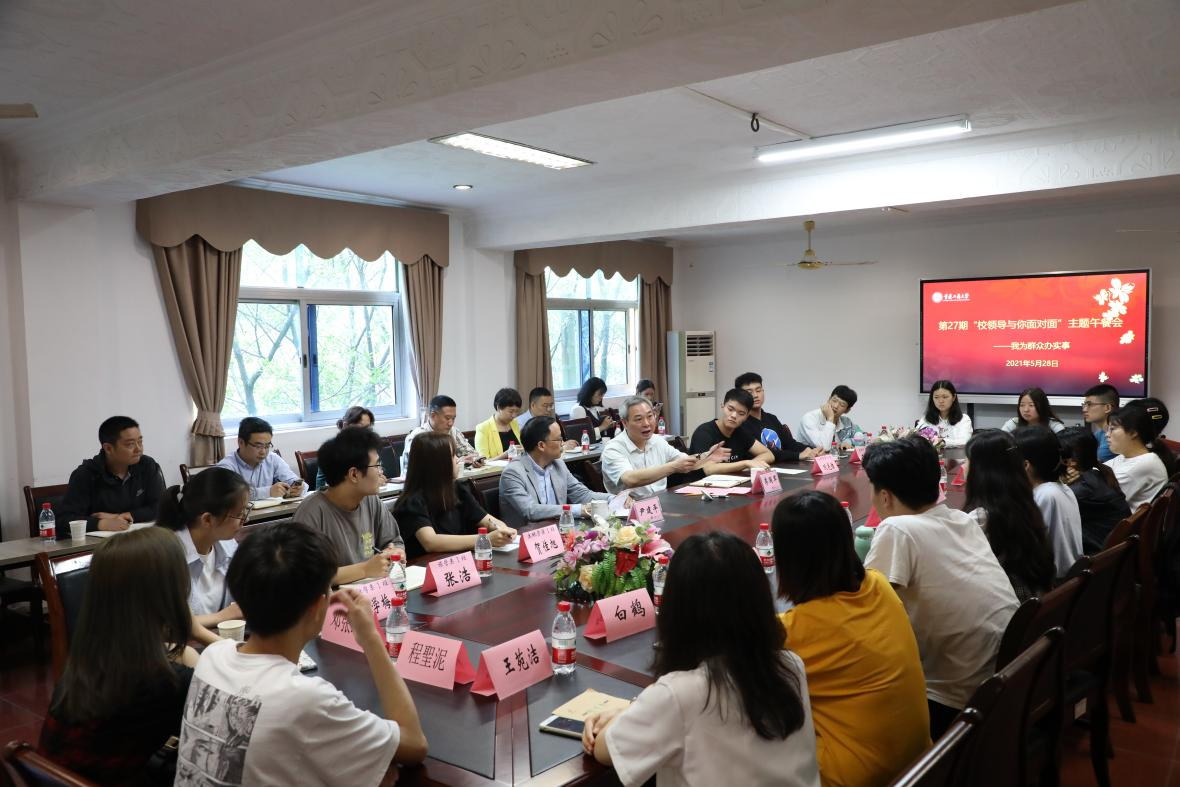 为进一步推进党史学习教育工作,以实际行动迎接中国共产党成立100周年,切实解决同学们在学习生活中面临的最关心、最直接、最现实的问题,5月28日上午,万象城官网在江北校区修德楼三楼会议室召开了第27期“校领导与你面对面”主题午餐会,副校长李国军出席会议,相关职能部门负责人、学生代表参加了本次会议。