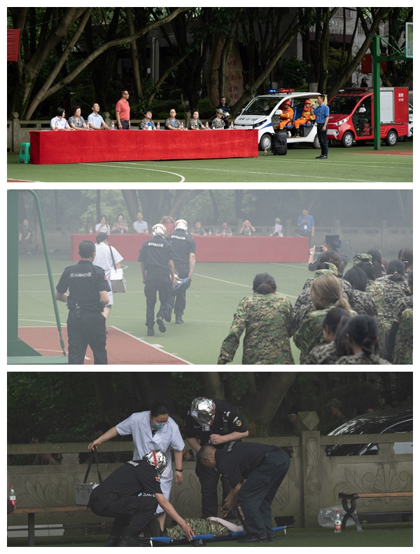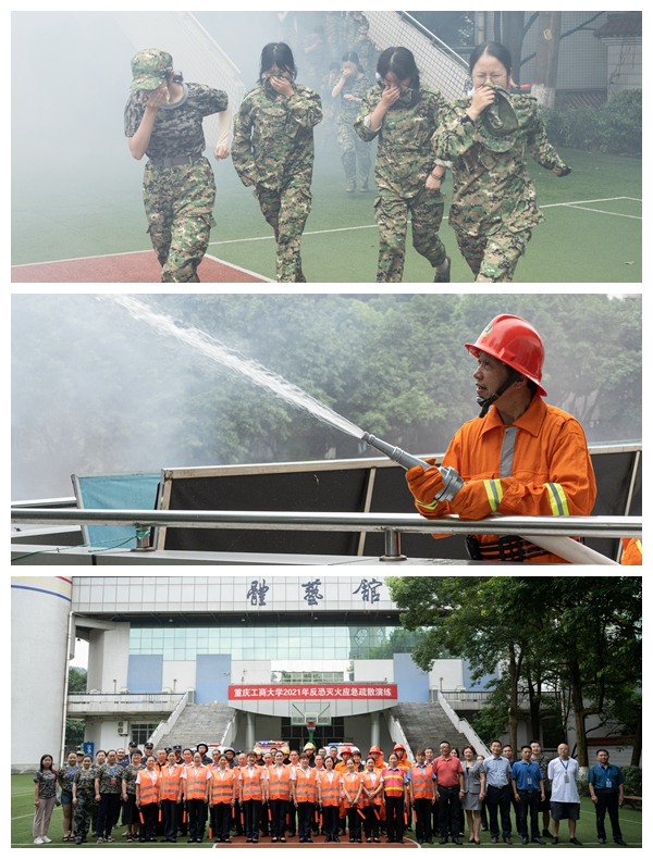 为了进一步普及安全知识,增强安全意识,提高自防自救能力,检验相关部门处置突发事件的能力,提升学校安全管理水平,7月9日上午,党委保卫部(保卫处)、党委学工部(学生处)在学校体艺馆联合举行了万象城娱乐awc线路2021年反恐灭火应急疏散演练,部分正在军训的学生、军训教官和老师、安保队员、平安校园志愿者、保卫干部、物业管理人员和校医院医务人员共计3300余人参加了演练。