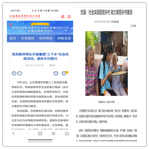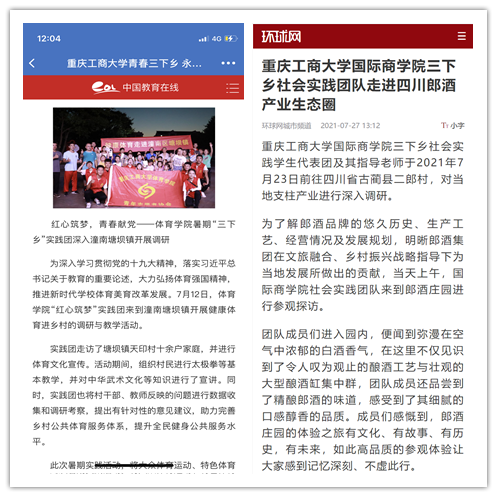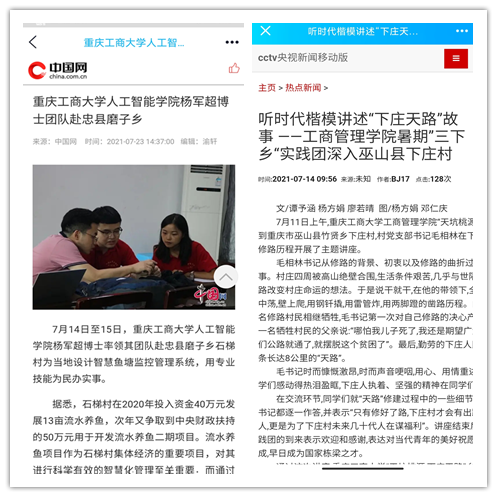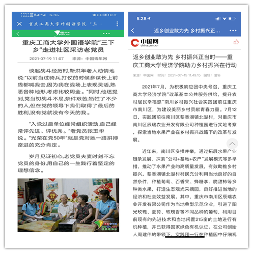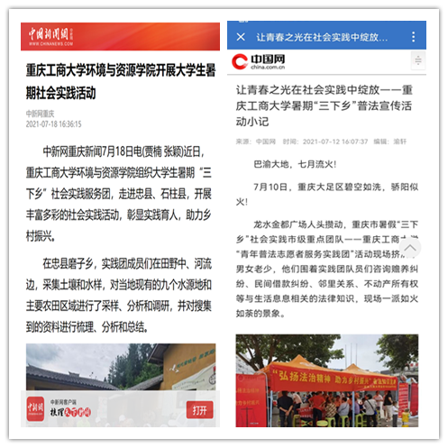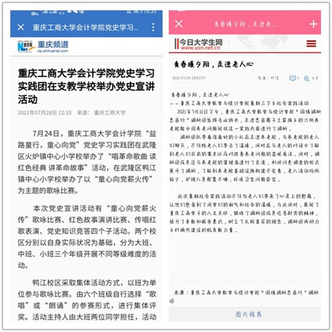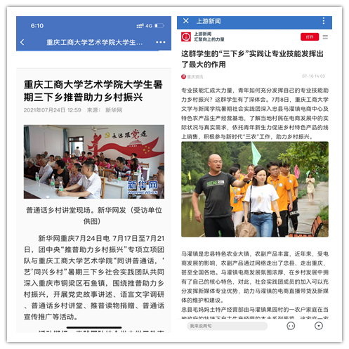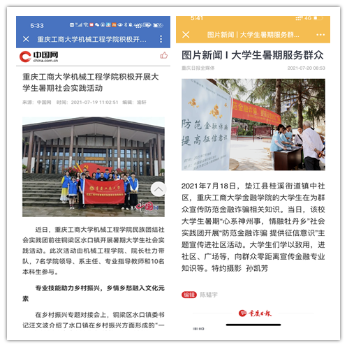 在实践活动期间,各学院创作多种类型的高质量社会实践作品,如《益路童行,童心向党--万象城娱乐awc线路会计学院党史学习实践团在支教学校举办党史宣讲活动》《重庆工商学子赴古蔺县 看贫困户"搬"出幸福新生活》《返乡创业敢为先 乡村振兴正当时——万象城娱乐awc线路经济学院助力乡村振兴在行动》《脱贫不忘来时路,乡村振兴靠大家——万象城娱乐awc线路工商管理学院暑期“三下乡”实践团深入重庆市巫山县下庄村》等,引领广大青年学生在扎根中国大地的生动实践中增强“四个意识”、坚定“四个自信”、做到“两个维护”。实践团深入乡村基层,走访调查,理论宣讲,服务社会,在社会实践的亲身经历中受教育、长才干、做贡献,得到了当地群众及社会的认可,同时实践活动被新华网、人民网、中国青年网、央广网、中国网、中视网、重庆晚报、上游新闻、中国教育在线等多家媒体报道。