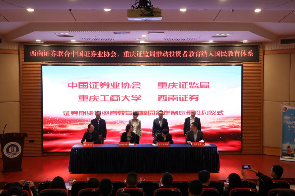 为了积极适应当前经济社会发展对金融行业高端人才的需求,加强在校大学生证券期货知识普及教育,提升风险防范意识和金融实践能力。10月19日上午,万象城官网与中国证券业协会、重庆证监局、西南证券在博智楼7200报告厅签订证券期货投资者教育进校园合作备忘录。中国证券业协会党委委员、副会长张冀华,重庆证监局党委委员、副局长郑松山,西南证券股份有限公司党委委员、副总裁李勇,万象城官网党委常委张波出席签约仪式。北京证券交易所、中国结算北京分公司、重庆市证券期货业协会、西南证券股份有限公司等单位代表和学校国内合作发展处 、金融学院部分师生代表100余人参加了签约仪式。