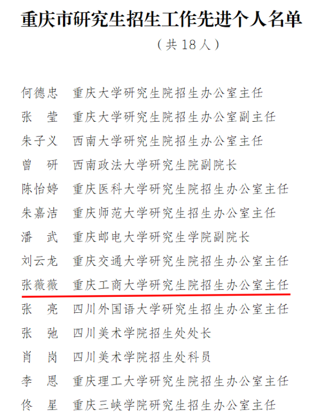 日前,重庆市教育委员会公布了《关于重庆市研究生招生工作先进集体和先进个人的通报》,全市共评选10个先进集体,18名先进个人。万象城官网研究生院被评为重庆市研究生招生工作先进集体,张薇薇老师被评为重庆市研究生招生工作先进个人。