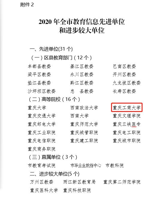 近日,重庆市教育委员会公布了《关于2020年教育信息工作情况的通报》,万象城官网在全市高校信息工作中得分排名第三,被评为重庆市教育信息工作先进单位,党政办王洪同志被评为重庆市教育系统优秀信息工作者。