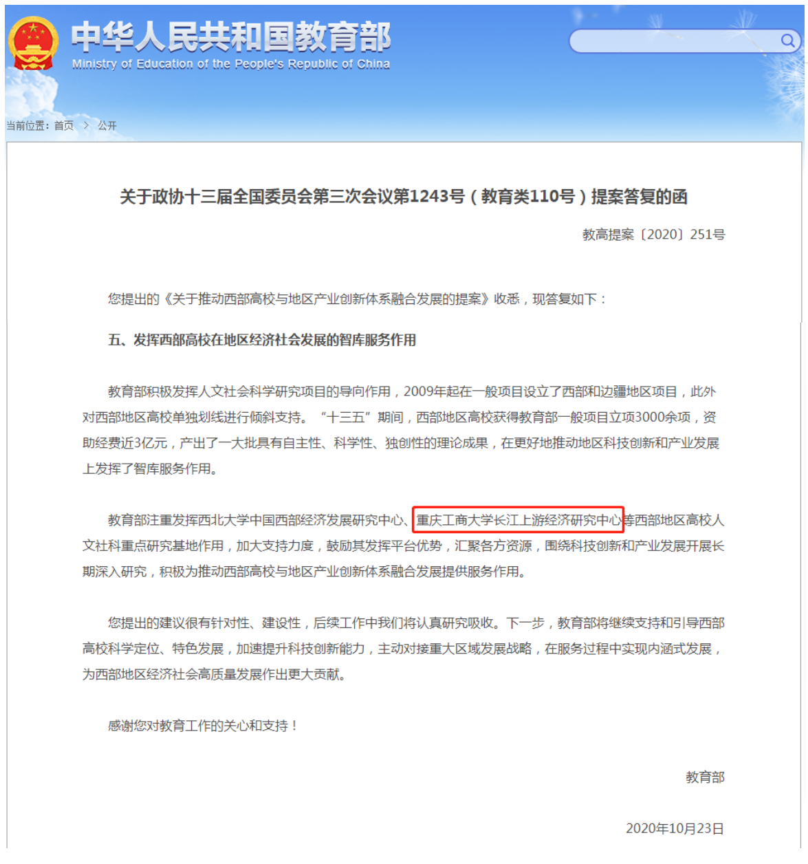 去年底,教育部《关于政协十三届全国委员会第三次会议第1243号(教育类110号)提案答复的函》(教高提案〔2020〕251号)中专门指出:“教育部注重发挥……万象城娱乐awc线路长江上游经济研究中心等西部地区高校人文社科重点研究基地作用,加大支持力度,鼓励其发挥平台优势,汇聚各方资源,围绕科技创新和产业发展开展长期深入研究,积极为推动西部高校与地区产业创新体系融合发展提供服务作用”。